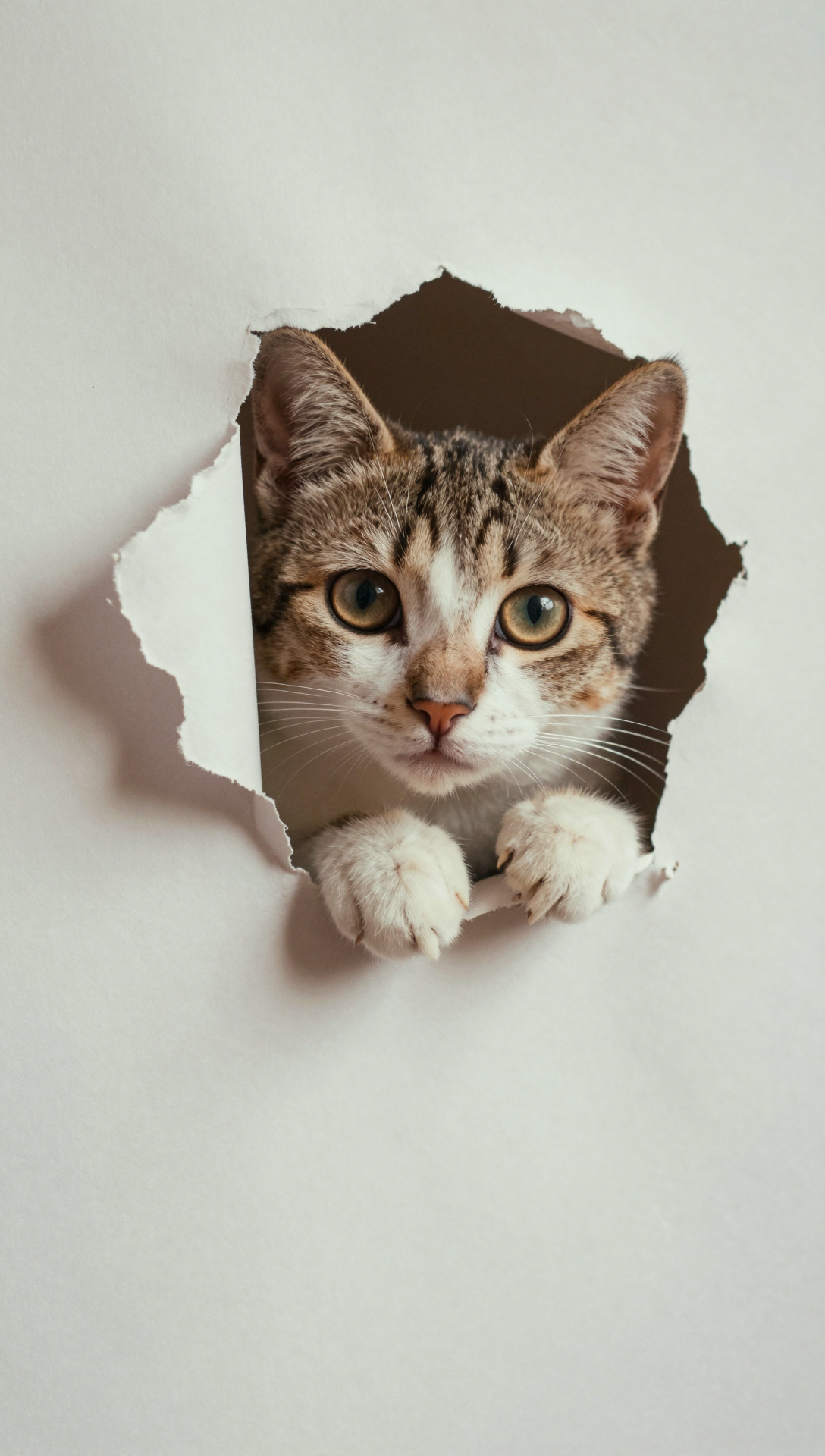 A small, cute cat with large, glossy, tan eyes peeking out from between the torn white paper walls, clutching the edges of the torn paper with its delicate, sharp claws., gentle innocent expression with slight curiosity, shallow depth of field, soft natural diffused lighting, clean minimal background, realistic macro photography composition, highly detailed paper fiber texture, cinematic focus on the eyes, ultra-sharp clarity, soft pastel color grading, professional 8k masterpiece quality, magical whimsical atmosphere,