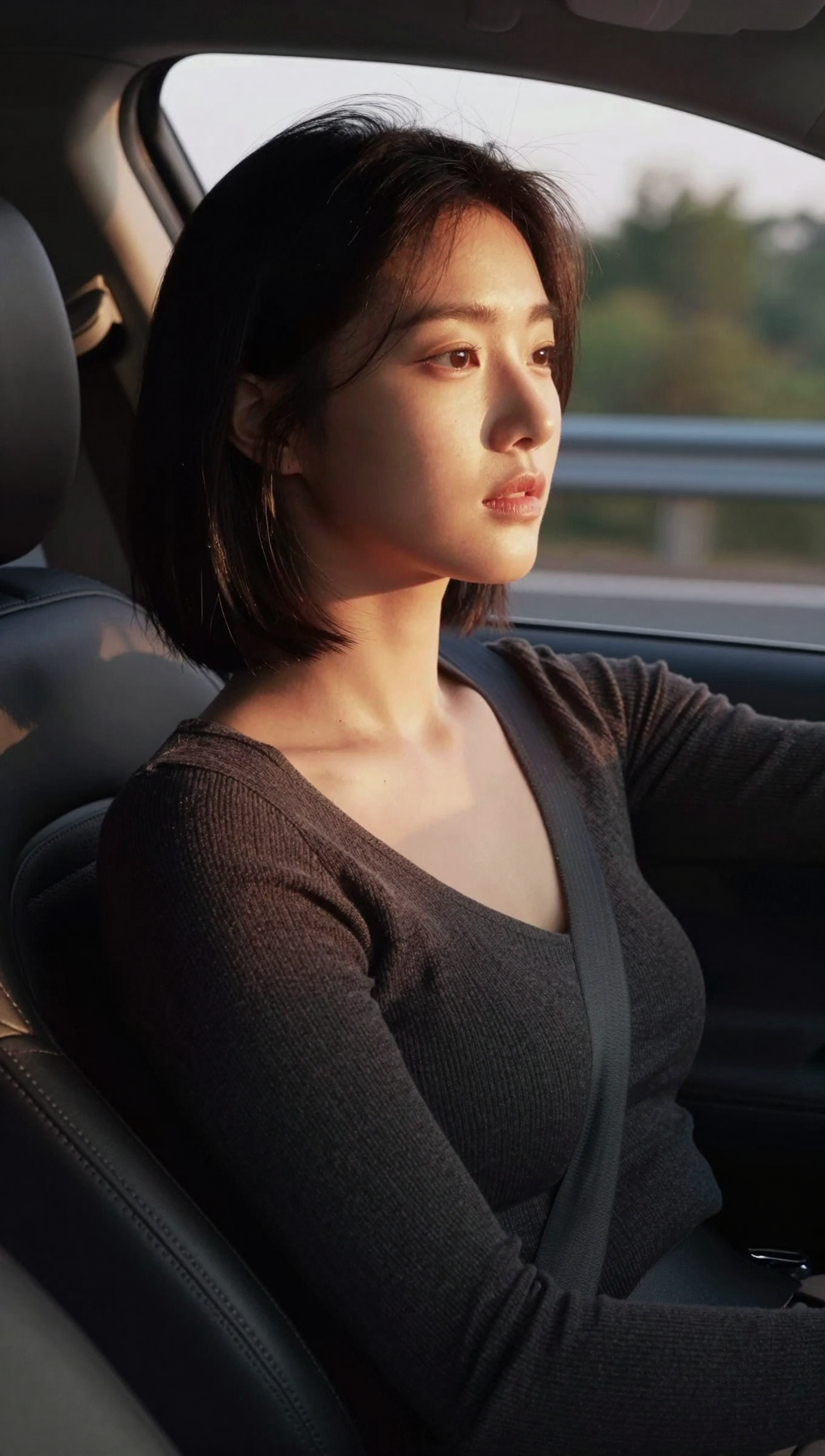 Beautiful cute Korean young woman driving a modern car during golden-hour sunset, calm focused expression with gentle reflective eyes, smooth natural skin, slim elegant figure with relaxed upright posture, short straight dark bob haircut softly framing her face, wearing a fitted dark textured knit long-sleeve top, seatbelt crossing naturally over her shoulder, warm sunlight illuminating her cheekbones and collarbone through the side window, soft shadows shaping her jawline, blurred roadside trees and guardrail passing outside, cinematic shallow depth of field, warm amber and soft brown color grading, ultra-clear facial focus, realistic skin and fabric texture, quiet introspective mood, professional cinematic lifestyle photography style, modern minimal aesthetic, peaceful emotional atmosphere, harmonious composition, ultra-high resolution, 4k masterpiece, premium visual quality