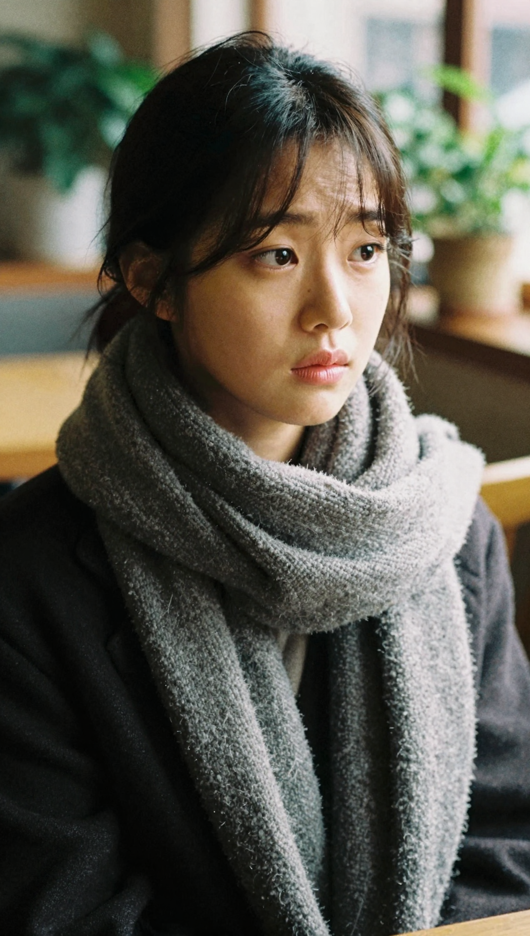 A beautiful Korean young woman in a quiet cozy indoor café setting, front-facing close-up composition, eyes wide with gentle worry and deep thought, lips softly pressed together, soft natural bangs slightly separated across her forehead, dark hair loosely tied back, wearing a thick gray knitted scarf wrapped warmly around her neck and a simple dark coat, calm yet anxious emotional expression, warm soft indoor lighting, blurred green plants and wooden furniture in the background, shallow depth of field, subtle cinematic film grain texture, smooth natural skin texture, minimal natural makeup, muted warm color palette, realistic emotional movie still atmosphere, high realism cinematic photography style, ultra high resolution 4k masterpiece quality