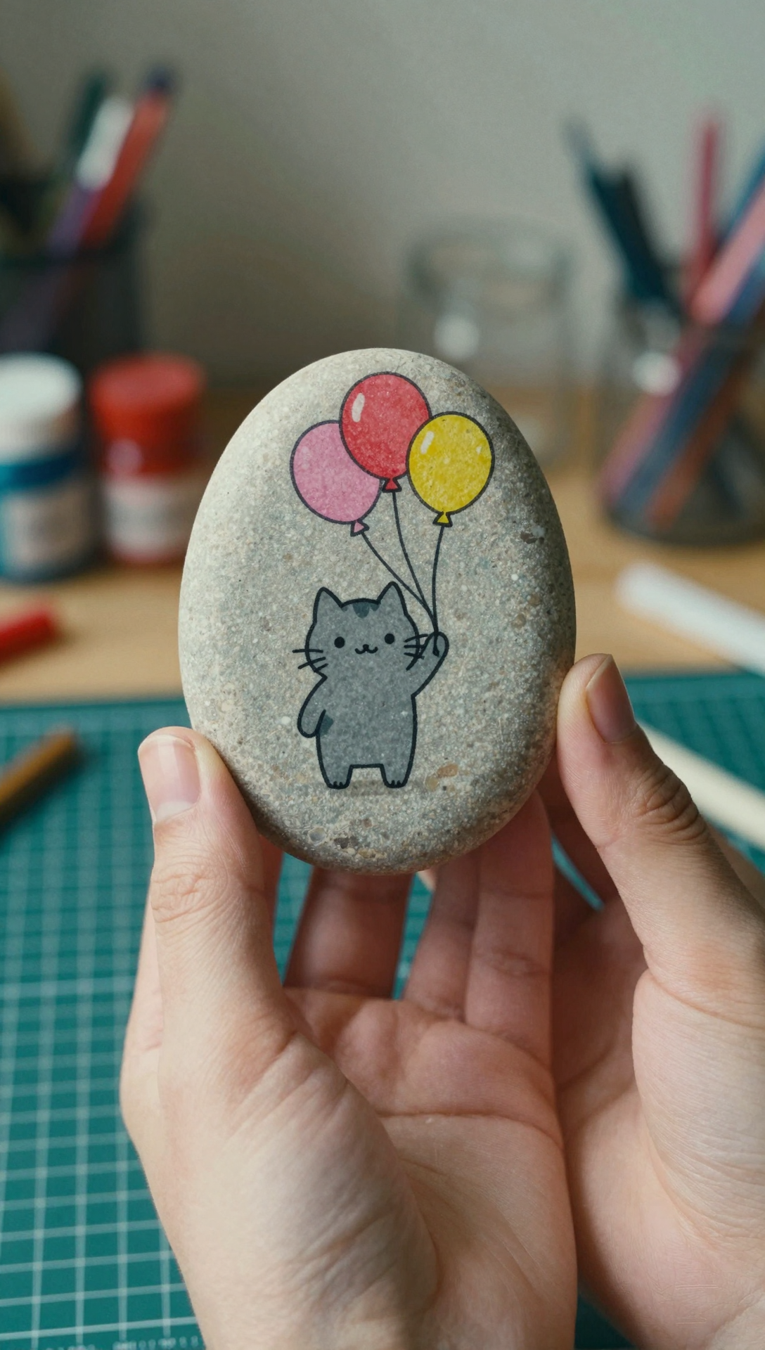 A smooth oval light-gray stone held gently between human fingers, featuring a cute hand-drawn gray cartoon cat floating while holding three colorful balloons in red, pink, and yellow, simple clean black lineart, soft matte stone texture, minimal kawaii illustration style, bright cheerful mood, shallow depth of field, blurred craft desk background with paint bottles, pens, glass jars and cutting mat, natural indoor lighting, crisp focus on the stone artwork, high clarity macro photography style, balanced soft colors, ultra high resolution 4k masterpiece quality