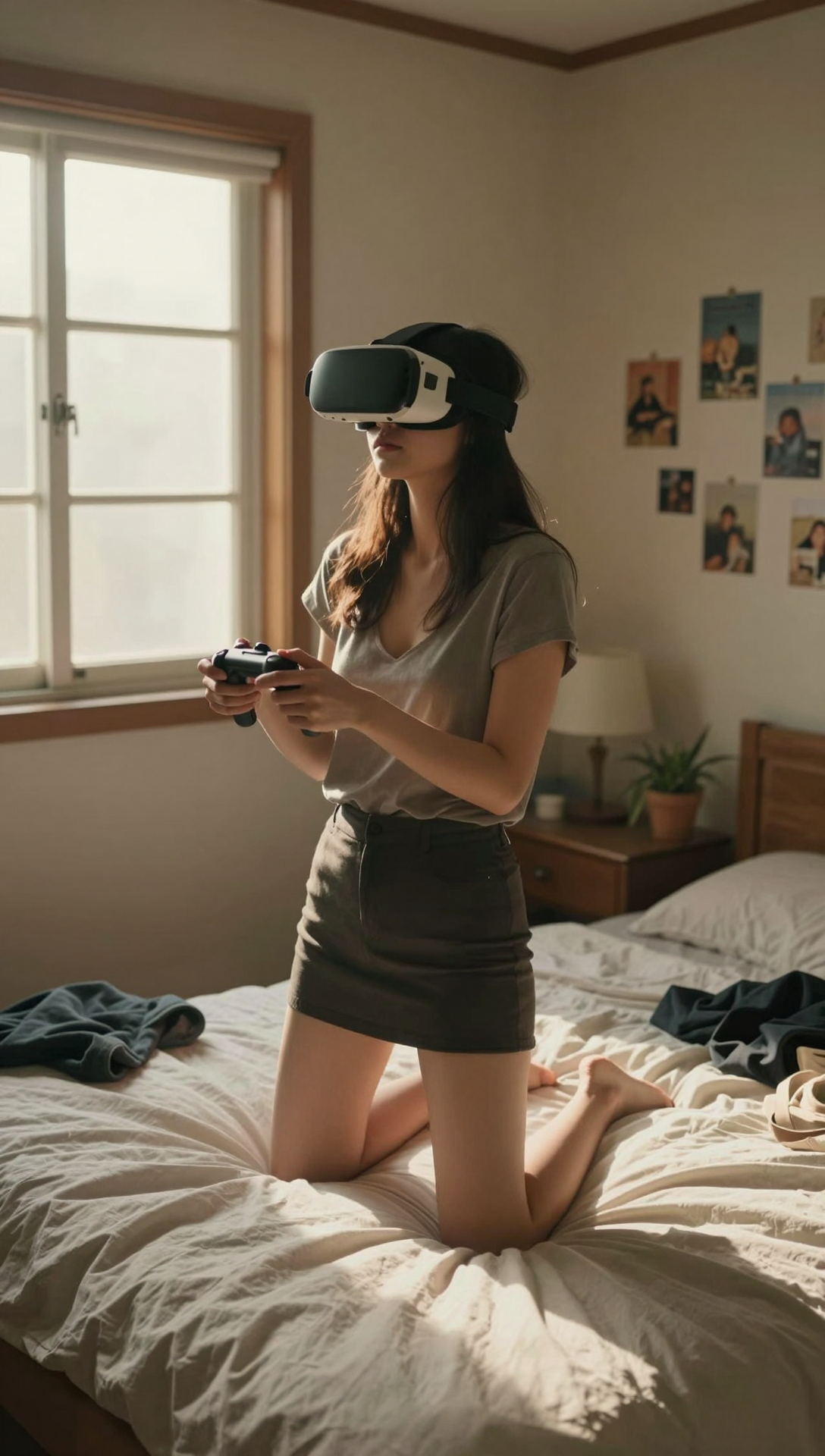 A cinematic ultra-realistic portrait of a young Korean woman Candid photography, She's standing, wearing a T-shirt and a short skirt, wearing VR goggles, holding controllers in both hands, immersed in a VR game. A cozy cinematic bedroom interior at golden hour, wide-angle static composition, unmade bed with soft white bedding and scattered clothes, warm sunlight streaming through a wooden-framed window casting long shadows, muted beige walls decorated with hanging paper garlands, postcards, and small photos, bedside lamp and potted plant adding homely detail, slightly cluttered lived-in atmosphere, nostalgic and intimate mood, soft warm color palette with gentle contrast, natural light only, shallow dust-in-the-air glow, indie film still aesthetic, calm and melancholic feeling, high-detail photorealism, analog photography vibe