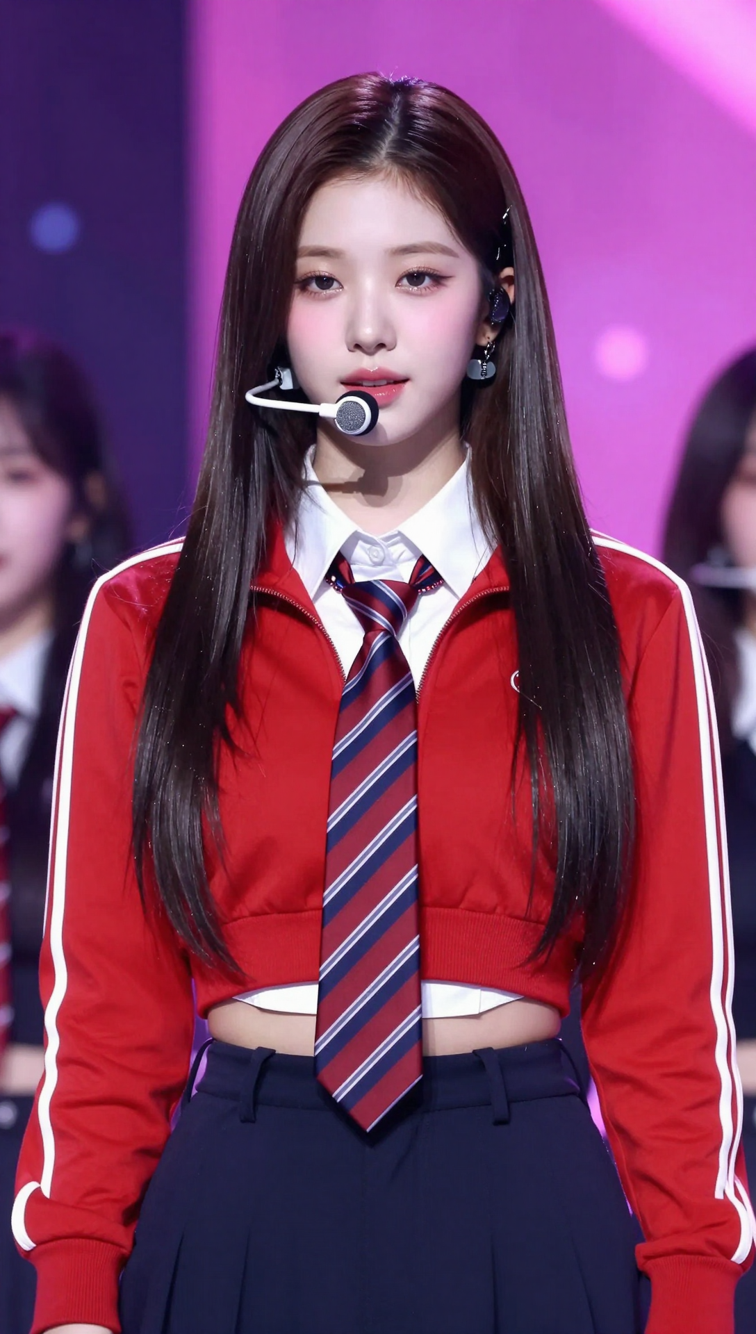 A beautiful stylish Korean young woman standing on a concert stage in a front-facing close-up composition, calm focused gaze slightly downward, soft confident expression, long straight dark brown hair neatly parted in the center with a small silver hairpin on one side, wearing a red cropped track jacket with white stripes over a white collared shirt, a navy red striped necktie hanging naturally, layered colorful bead necklaces with a small pendant, high-waisted dark pants, slim waist visible, headset microphone positioned near her lips, smooth natural skin texture, subtle glossy lips, refined eye makeup, vibrant pink and purple stage lighting background with soft bokeh, shallow depth of field, clean concert atmosphere, high contrast vivid colors, elegant idol stage photography style, ultra high resolution 4k masterpiece quality