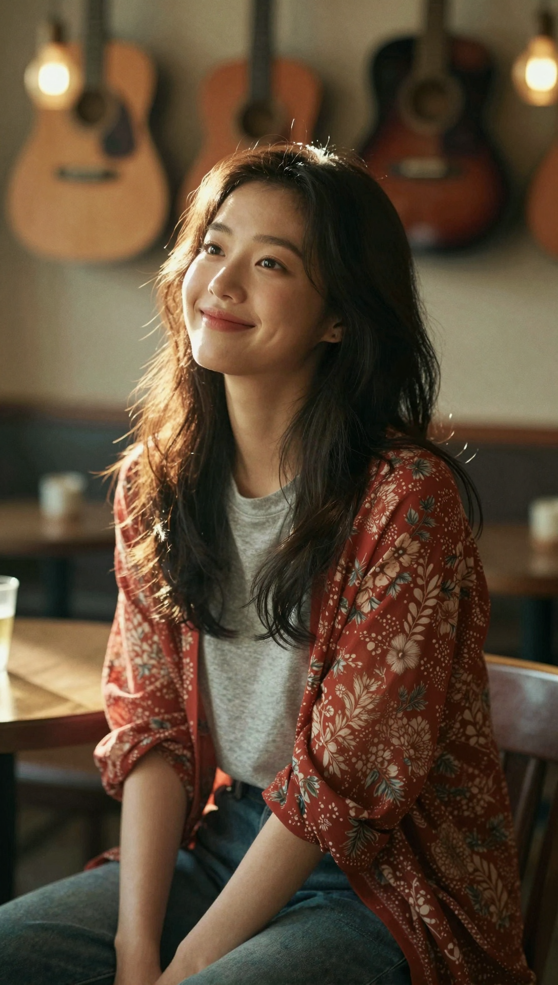 A beautiful stylish Korean young woman sitting in a warm cozy music café, three-quarter angle from the right, softly smiling while looking slightly upward, gentle bright eyes, long naturally wavy dark brown hair falling over her shoulders, wearing a light gray t-shirt layered with a red floral patterned chiffon cardigan, relaxed elegant posture leaning slightly forward, warm golden backlight creating soft lens flare around her hair, hanging guitars softly blurred in the background, glowing bokeh lights, shallow depth of field, cinematic warm atmosphere, emotional comforting mood, smooth natural skin texture, minimal natural makeup, balanced warm color palette, lifestyle photography style, ultra high resolution 4k masterpiece quality