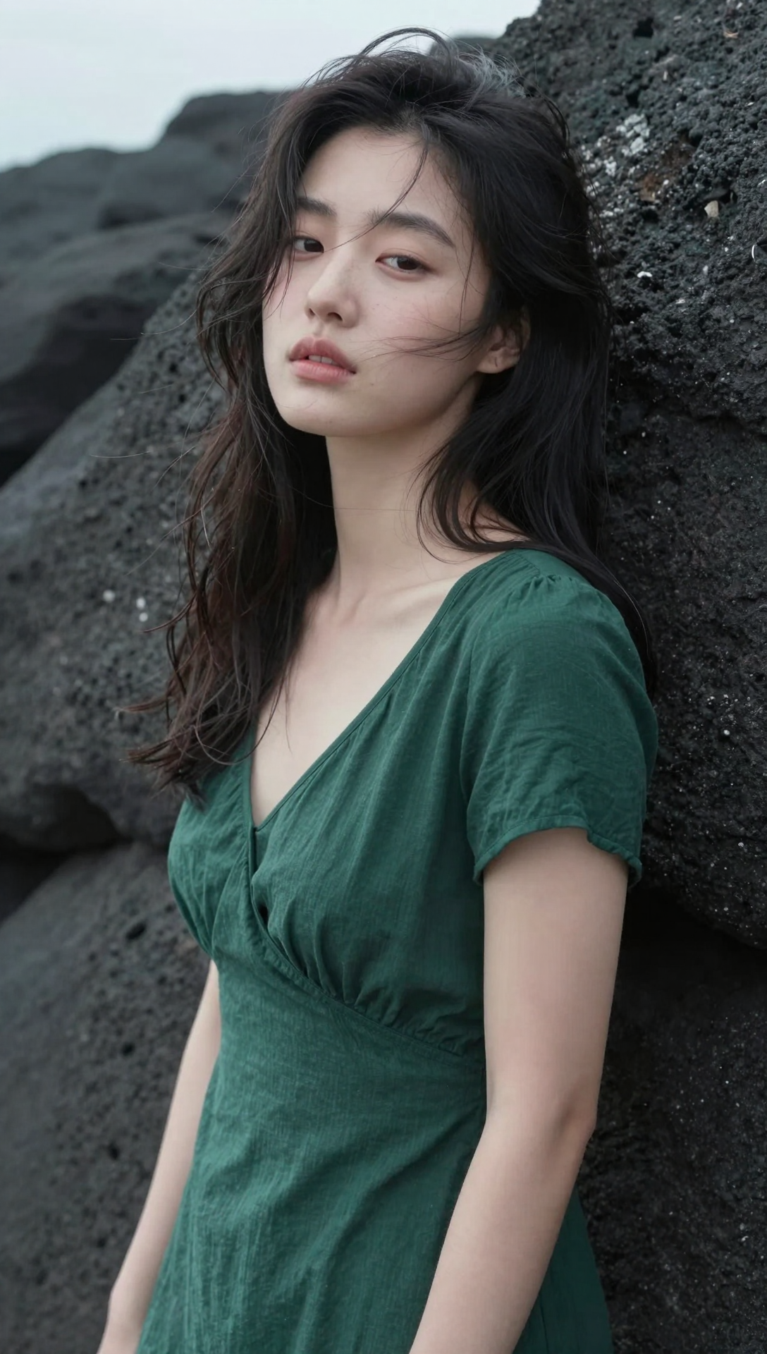 Beautiful cute Korean young woman standing beside a rugged dark volcanic rock wall near the seaside, soft wind gently moving her long wavy black hair across her face, calm melancholic expression with slightly glossy eyes and relaxed lips, smooth natural skin with subtle freckles and natural texture, slim delicate figure, wearing a deep forest-green short-sleeve dress with soft gathered fabric at the shoulders, muted natural color palette, overcast coastal daylight creating soft diffused highlights and gentle shadows, cinematic shallow depth of field isolating her from the textured stone background, ultra-clear facial focus, realistic skin and fabric rendering, fine film grain texture, professional cinematic portrait photography style, poetic emotional atmosphere, quiet introspective mood, balanced composition, modern fine-art aesthetic, ultra-high resolution, 4k masterpiece, premium visual quality