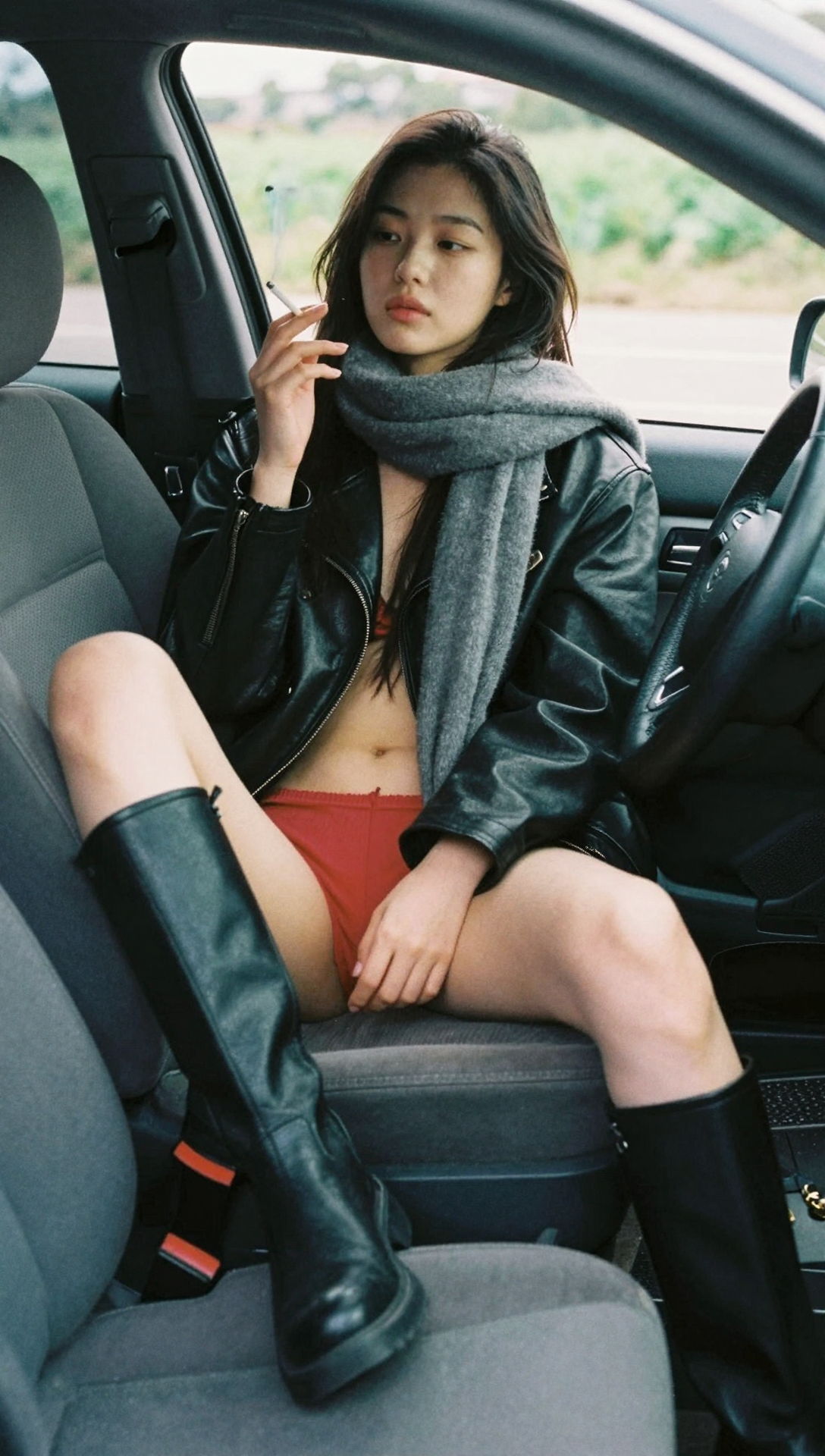 A woman sitting in the driver's seat of a car, smoking a cigarette. she is wearing a black leather jacket, a gray scarf, and black knee-high boots. her long, hair cascades down her back, and she has a neutral expression on her face. her legs are spread apart, revealing a pair of red panties. the car is parked on a gravel road, with a blurred background of greenery visible outside the window. the interior of the car includes a gear shift, a cup holder, and a bag on the floor.