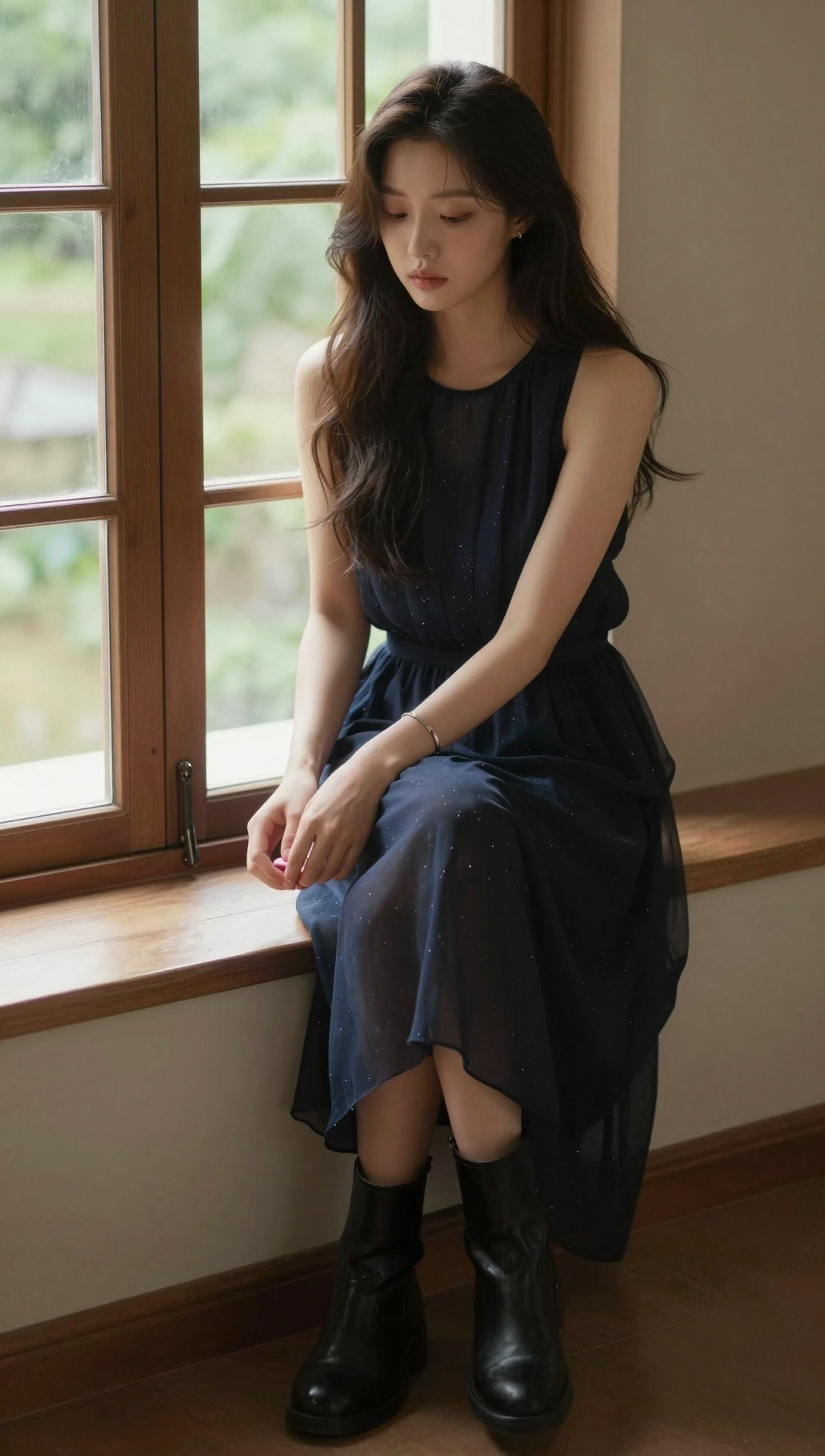 A beautiful stylish Korean young woman sitting quietly on a wide wooden window sill inside a warm vintage room, knees gently together, hands resting loosely while holding a small pink object, head slightly lowered, eyes gazing downward with a calm melancholic expression, long naturally wavy dark brown hair falling over her shoulders, wearing a sleeveless dark navy layered chiffon dress with subtle shimmer, black ankle boots, thin metallic bracelet on her arm, soft natural daylight coming through large window panes behind her, blurred green outdoor scenery, warm beige and brown interior tones, shallow depth of field, cinematic soft haze, gentle film grain texture, emotional introspective atmosphere, elegant fashion editorial photography style, smooth natural skin texture, minimal makeup, refined composition, professional ultra high resolution 4k masterpiece quality