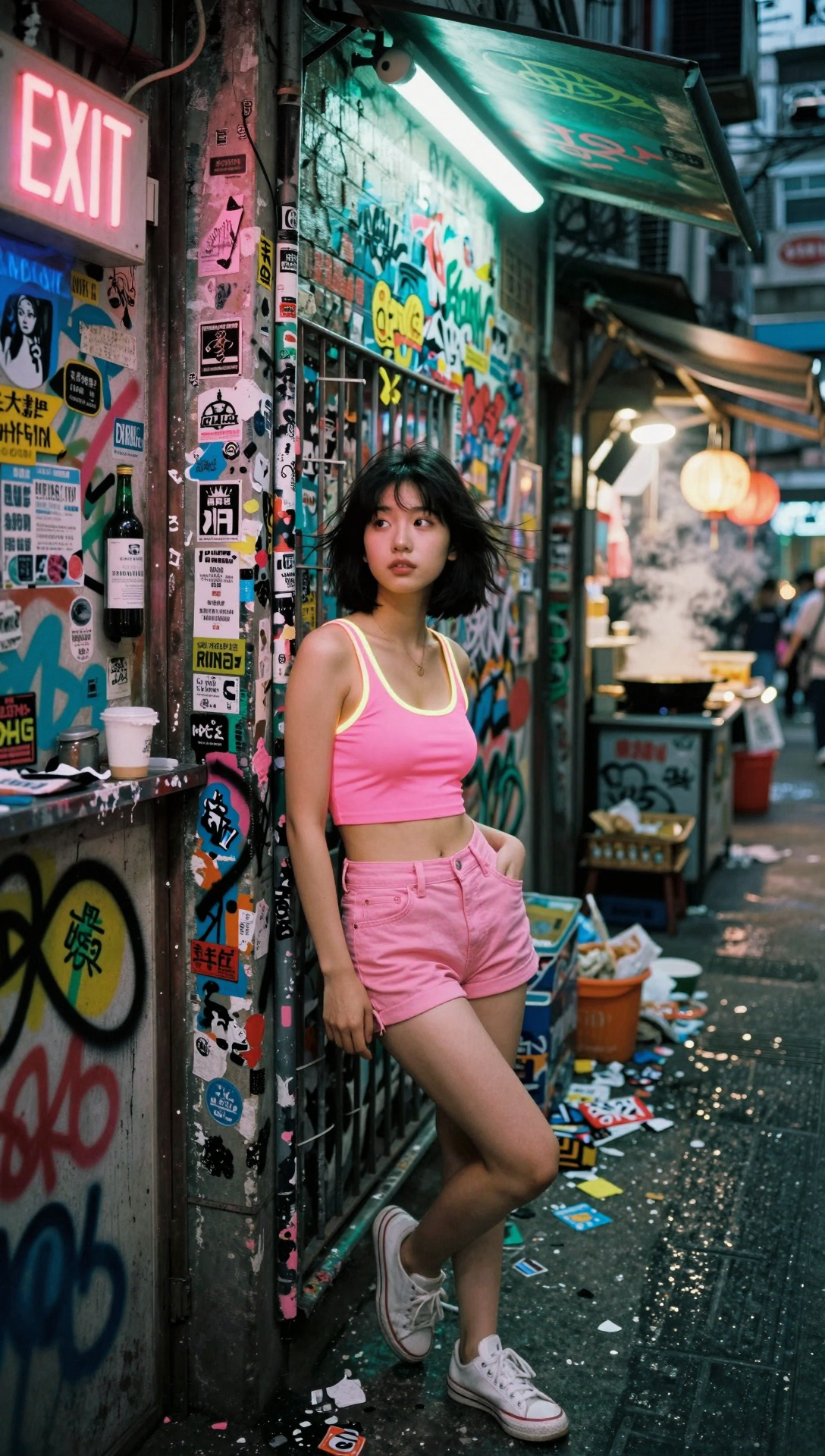 The night street photography, iPhone 15 Pro natural low-light shot with slight lens flare, realistic grain, chromatic aberration and warm neon light bloom, young Asian woman with short bob-cut black hair standing against a narrow metal fence in a bustling night market alley, she wears tight pink-fluorescent retro crop top with glowing neon accents, high-waisted pink shorts, white sneakers, casual relaxed pose leaning back on fence with one hand in pocket, looking slightly upward with curious expression, short hair slightly ruffled by night breeze. Background: densely layered chaotic graffiti wall covering the entire facade of an old brick building in a narrow Hong Kong-style alley entrance, hundreds of colorful overlapping street art murals, fluorescent spray paint tags, urban stickers, concert flyers, food stall ads, vendor signs, neon graffiti words like various Chinese-English-Korean mixed urban graffiti, layered thickly with peeling edges, faded colors, duct tape residues, spray drips realistic visible, neon tube lights and overhead string bulbs casting multi-color glows with pink, green, blue contrasts, pink "EXIT" neon sign in upper left glowing, ground littered with discarded food wrappers and plastic cups, distant visible alley stalls with steaming woks and hanging lanterns, nighttime urban alley atmosphere, wet pavement reflections, air with light food smoke haze, overall vibrant underground street culture vibe intense. Warm pink fluorescent streetlight mixed with cool green-blue neon glow, high contrast, rich shadows and highlights on graffiti and her face, detailed textures on paint drips, sticker peels, crop top fabric, hair strands, skin pores, realistic night photography mood, cinematic street photography style, 35mm film emulation