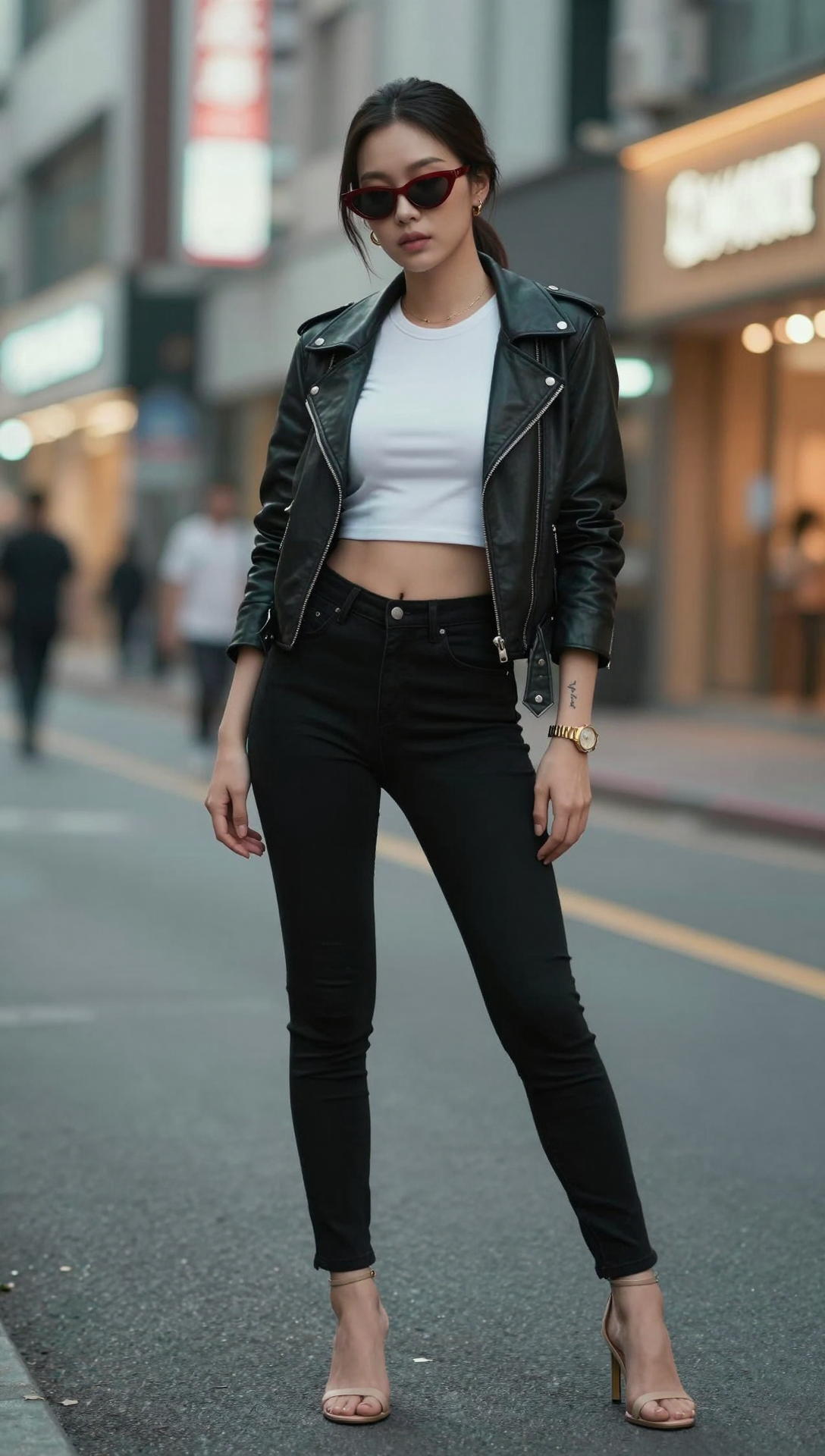 Ultra-detailed full-body street fashion portrait of a beautiful stylish Korean young woman standing confidently in the middle of an urban street at dusk, slight contrapposto pose with one hip relaxed forward, shoulders naturally open, head slightly tilted downward, calm cool expression with subtle neutral lips, sleek low ponytail with loose front strands, narrow dark red sunglasses, black leather biker jacket over a fitted white crop top, high-waisted black skinny jeans, nude high-heel sandals, delicate tattoos on forearm, gold wristwatch, soft cinematic city bokeh background with neon storefront lights, shallow depth of field, muted teal and warm orange color grading, elegant urban mood, modern editorial fashion photography style, natural skin texture, soft contrast lighting, ultra realistic 4k masterpiece quality