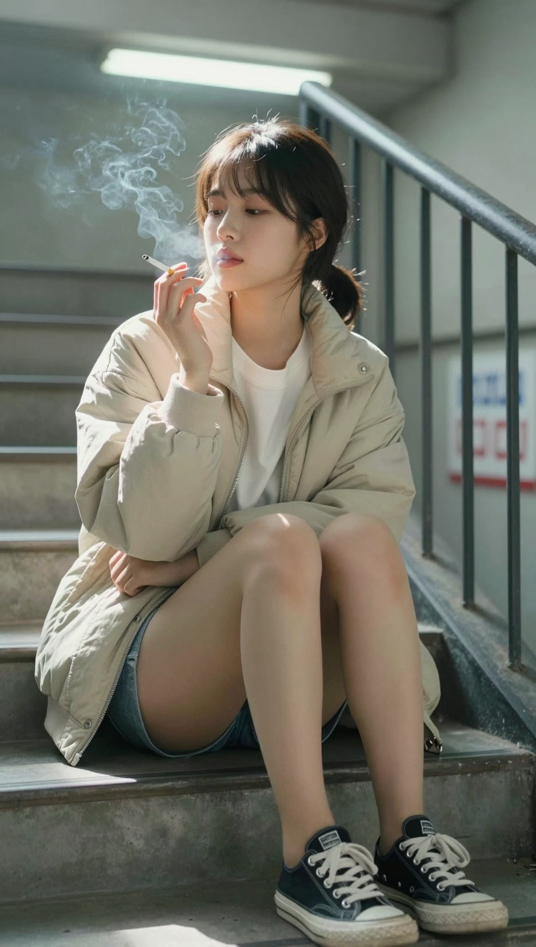 Beautiful cute Korean young woman sitting casually on an indoor concrete stairway, soft fluorescent ceiling light creating gentle highlights on her face and jacket, calm slightly distant expression with relaxed eyes, lips softly parted while exhaling faint vapor from a cigarette, gaze lowered toward her cigarette held loosely in one hand, subtle quiet confidence in her gaze, smooth natural skin, dark hair tied in a low ponytail with light bangs framing her face, wearing a beige padded jacket over a white sweatshirt, denim shorts, sheer beige stockings, and black-and-white low-top sneakers, relaxed seated posture expressing youthful solitude, metal stair railings and industrial wall textures surrounding her, blurred Korean signage in the background, cinematic shallow depth of field, neutral cool color grading with soft contrast, realistic fabric and skin texture, quiet urban atmosphere, modern lifestyle photography style, emotional stillness and calm presence, balanced centered composition, ultra-high resolution, 4k masterpiece, premium visual quality
