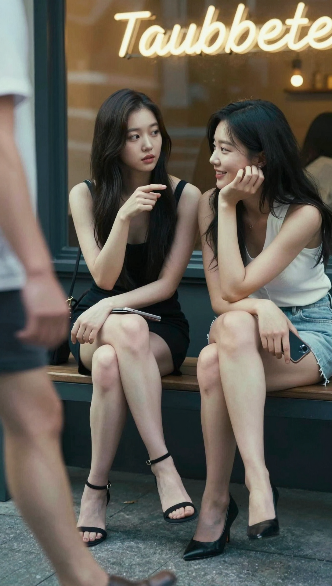 Ultra-detailed cinematic street lifestyle photography of two beautiful, cute Korean young women with natural dark eyes, sitting closely together on a modern outdoor bench in front of a softly glowing café neon sign in English, both with long straight dark hair, one wearing a simple black sleeveless mini dress with black ankle-strap heels and holding a slim clutch while gently pointing with a thoughtful curious expression, the other wearing a white sleeveless top, light denim shorts, and black heels, resting her chin on her hand while looking at her friend with a warm attentive smile, smartphones resting casually in her hand, relaxed crossed-leg posture, shallow depth of field with softly blurred pedestrians passing in the foreground creating natural frame, warm indoor café light mixing with cool evening street tones, soft cinematic color grading, realistic skin texture, clean fashion editorial mood, subtle film grain, balanced composition, emotional atmosphere of quiet conversation and friendship, professional 35mm lens look, f1.8 aperture, high dynamic range, ultra-clean rendering, 4k ultra-high resolution, masterpiece quality