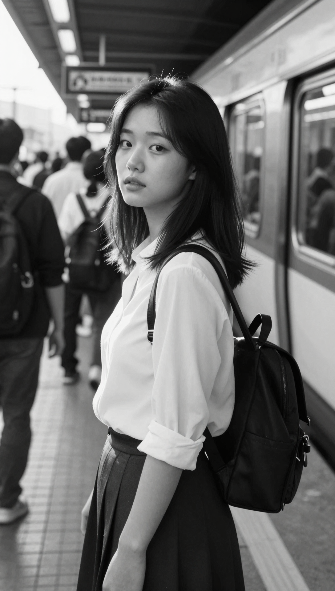 Ultra-detailed cinematic black-and-white street photography of a beautiful, cute Korean young woman with natural dark eyes and straight shoulder-length black hair, standing on a crowded subway platform among commuters in business attire, wearing a white blouse, dark pleated skirt, and a simple black backpack, her body facing forward while her head turns slightly back toward the camera with a quiet, thoughtful, subtly nostalgic expression, soft sunlight entering from the upper left creating gentle rim light on her hair and shoulders, strong depth perspective with a stationary subway train on the right and rows of waiting passengers fading into background blur, English station signage softly visible above in clean typography, shallow depth of field isolating the subject, smooth skin texture, realistic fabric detail, soft film grain, high contrast monochrome tonal range, emotional atmosphere of youth and fleeting moments, professional 35mm lens look, f1.8 aperture, perfectly balanced composition, cinematic realism, editorial photography style, 4k ultra-high resolution, masterpiece quality