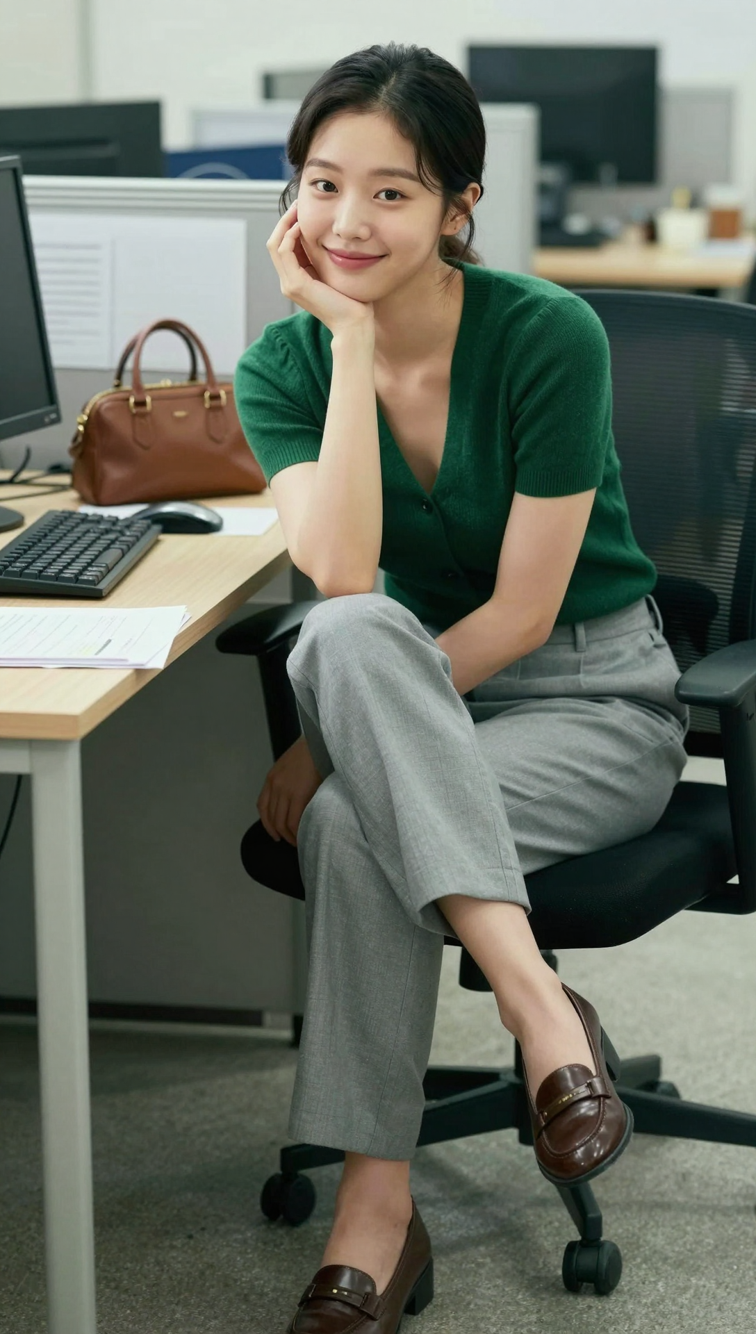Ultra-detailed realistic office portrait of a stylish young Korean woman with natural dark black eyes and smooth clear skin, soft black hair neatly tied in a low bun, wearing a dark green short-sleeve knit top, light gray tailored trousers, and brown leather loafers, sitting casually on a black office chair beside a wooden desk, one leg crossed over the other, resting her cheek lightly on her hand with a gentle warm smile, modern office environment with computer monitor, keyboard, papers, and a brown leather handbag on the desk, soft indoor fluorescent lighting with natural skin tones, balanced vertical composition, shallow depth of field, 50mm lens look, realistic fabric texture and subtle shadows, calm professional atmosphere, elegant Korean office fashion aesthetic, cinematic color grading, ultra-clean high-resolution 4k masterpiece quality, no visible text, no logos, no watermarks.