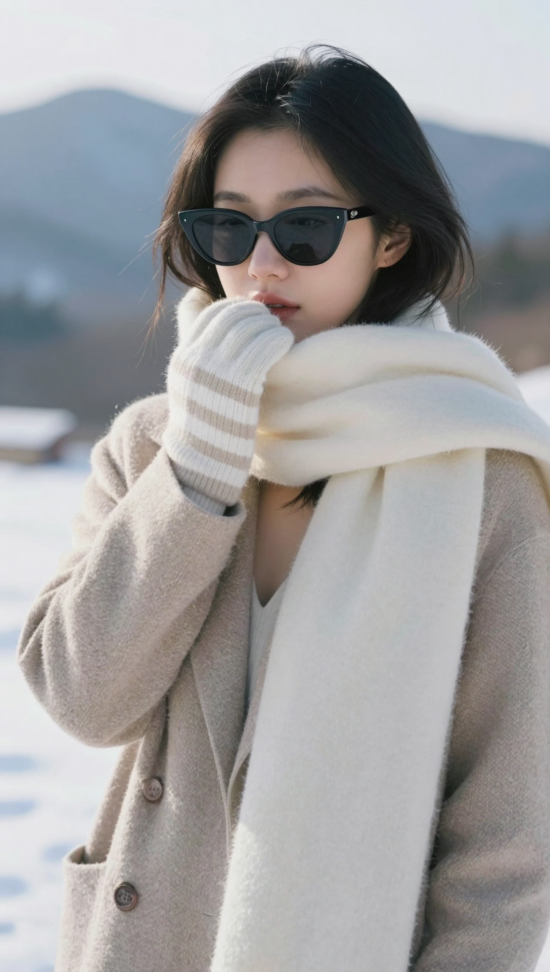 A beautiful stylish Korean young woman with natural dark eyes and short softly waved black hair stands outdoors in a quiet winter mountain landscape, wearing sleek black cat-eye sunglasses, a thick cream wool scarf wrapped high around her face, a soft beige knit sweater, and striped beige-and-white knitted gloves gently covering her mouth, her expression calm, reserved, and slightly shy beneath the scarf, gaze hidden behind reflective lenses, posture relaxed and elegant, captured at eye-level with shallow depth of field, cool winter daylight creating soft natural highlights on her hair and smooth skin tones, distant blue-gray mountain ridges softly blurred in the background, clean sky with pale winter tones, minimal composition, gentle contrast, refined color balance, quiet emotional atmosphere, modern lifestyle portrait photography style, elegant natural realism, ultra high resolution, professional 4k masterpiece quality