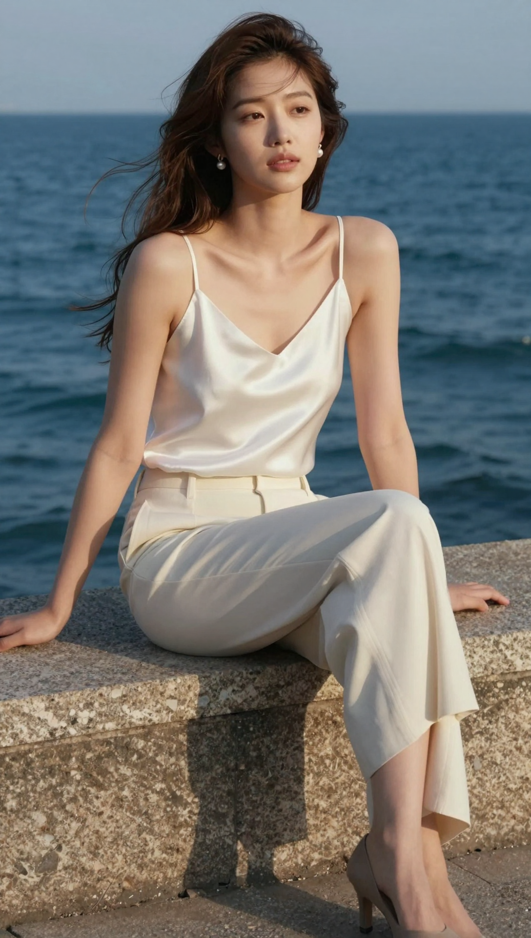 Ultra-detailed cinematic coastal fashion photography of a beautiful, cute Korean young woman with natural dark eyes and softly tousled light brown hair tied loosely back, sitting gracefully on a sunlit stone ledge by the deep blue ocean, wearing a silky white sleeveless camisole top and elegant cream tailored pants, barefoot with relaxed natural posture, one knee raised and one leg extended, calm confident serene expression while gazing slightly into the distance, soft golden-hour sunlight illuminating her face and shoulders, gentle sea breeze moving loose hair strands, minimal jewelry with pearl-style earrings, clean natural makeup, warm skin highlights contrasting with cool ocean tones, shallow depth of field with softly blurred horizon, realistic fabric texture, refined luxury atmosphere, high-end fashion editorial style, professional 85mm lens look, f1.8 aperture, high dynamic range, balanced composition, modern elegance mood, 4k ultra-high resolution, masterpiece quality