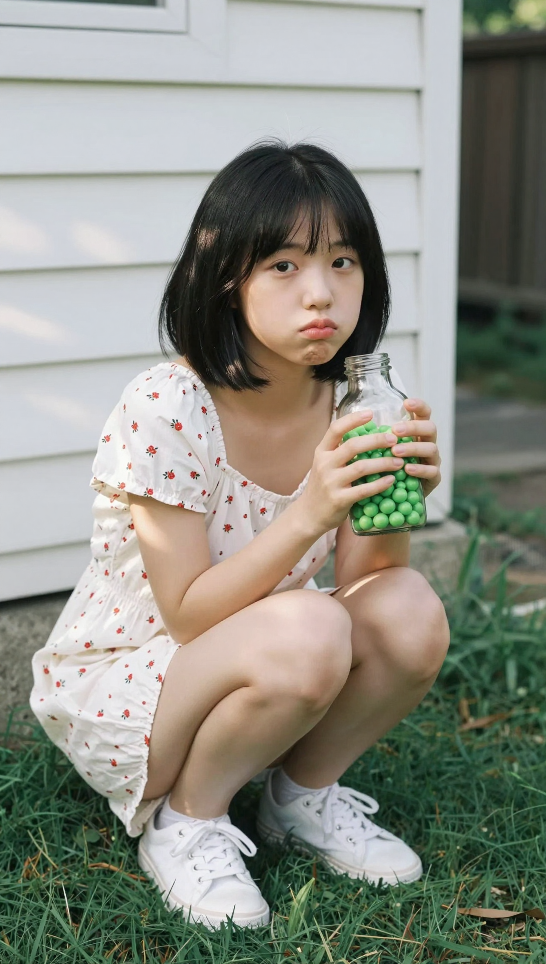 Extremely detailed single-line z-image prompt (safe, wholesome tone): A cute Korean young girl with natural dark eyes squatting on green grass in a quiet backyard beside a white wooden house, holding a clear glass bottle filled with small bright green round candies in both hands, short straight black bob hair with soft bangs framing her face, wearing a white short-sleeve dress with tiny red floral prints and white sneakers, her expression slightly pouty, thoughtful, and innocent as she looks directly at the camera, soft afternoon sunlight filtering through nearby trees creating gentle leaf shadows on the ground and her dress, shallow depth of field with softly blurred house siding and garden background, natural skin texture, clean youthful atmosphere, pastel-toned color grading, fine-art childhood lifestyle photography style, calm nostalgic mood, balanced composition, ultra-high resolution, refined modern realism, professional masterpiece quality.