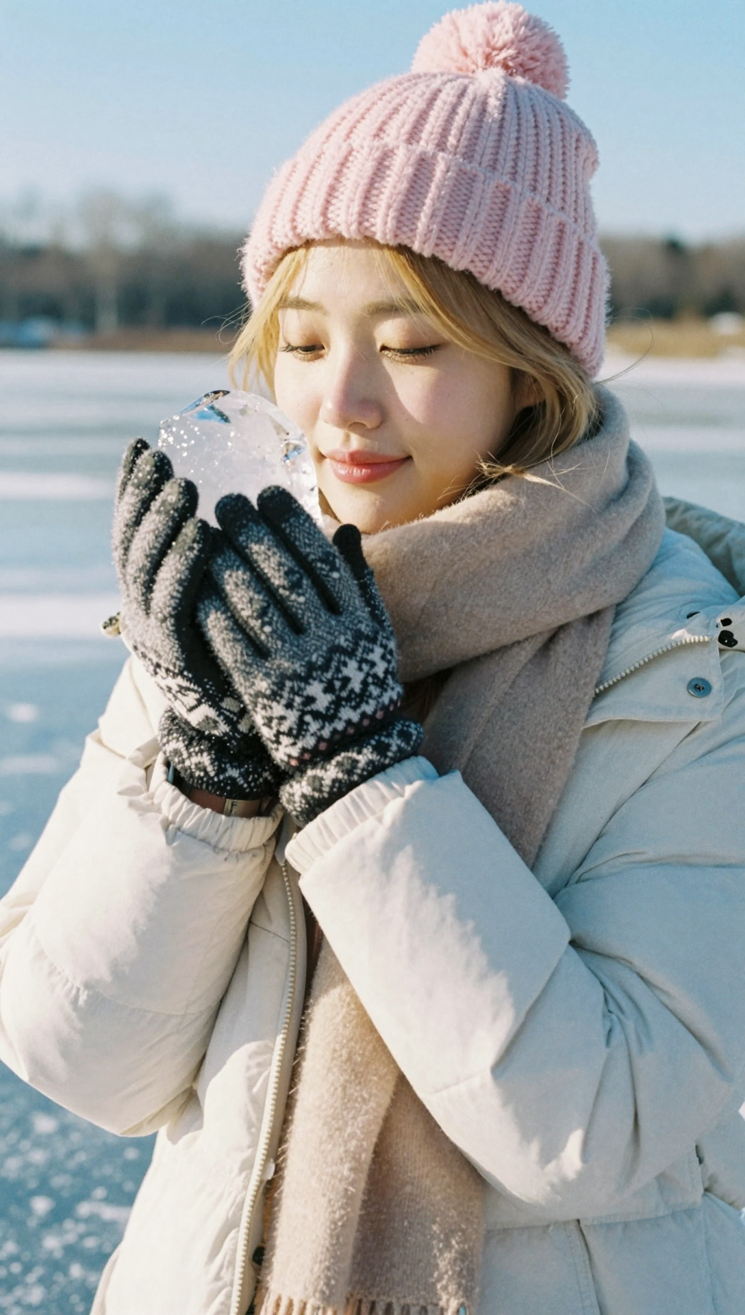 A beautiful cute Korean young woman with natural dark eyes and softly styled blonde-toned hair stands beside a frozen lake under a clear blue winter sky, wearing a soft pink knit beanie with a fluffy pom-pom, a thick beige wool scarf, a white padded winter jacket, and patterned knitted gloves, gently holding a clear irregular ice crystal close to her cheek with both hands, her eyes peacefully closed and lips forming a soft content smile, expression calm, warm, and quietly joyful, captured in a close-up portrait at eye-level with shallow depth of field, bright winter sunlight creating clean sparkling highlights inside the transparent ice and smooth natural skin tones, frozen lake surface and distant treeline softly blurred in the background, fresh crisp atmosphere, pastel winter color harmony, gentle contrast, refined lighting balance, modern lifestyle winter portrait photography style, elegant natural realism, ultra high resolution, professional 4k masterpiece quality
