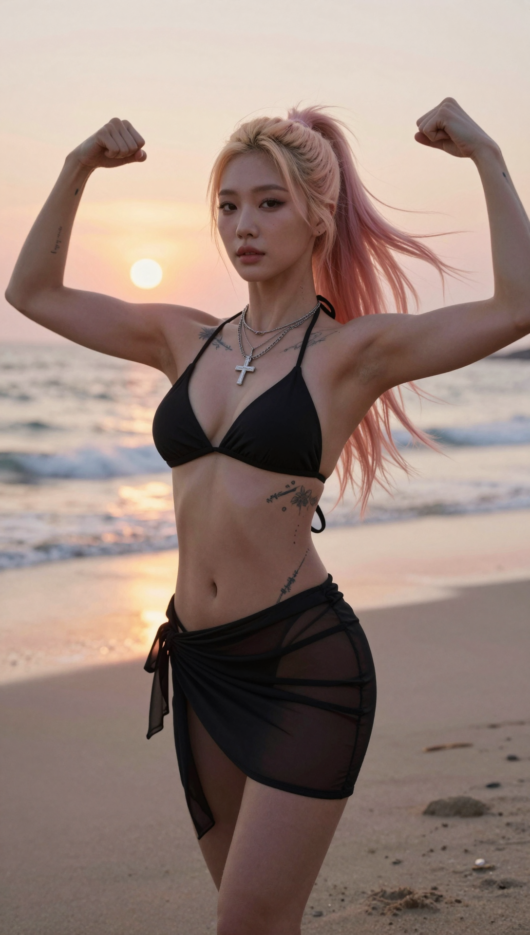 Extremely detailed single-line z-image prompt: A beautiful cute Korean young woman with natural dark eyes standing confidently on a sandy beach at sunset, captured in a powerful front-facing three-quarter body pose while flexing both arms upward in a strong athletic gesture, long high ponytail hair flowing in a soft gradient of light blonde to pastel pink tones, wearing a stylish black bikini top with elegant layered silver cross necklaces and a sheer black wrap skirt tied at the waist, her physique toned and graceful with defined arms and waist, subtle artistic tattoos decorating her shoulders, arms, and rib area in fine-line floral and geometric styles, calm confident gaze directed toward the camera with a bold yet elegant expression, warm golden sun low on the horizon behind her, gentle ocean waves and soft reflections in the background, cinematic rim light outlining her silhouette, smooth natural skin texture, refined makeup with soft smoky eyes and nude lips, shallow depth of field, warm peach and pastel sky gradient, modern fashion fitness photography style, powerful feminine mood, balanced composition, ultra-high resolution, refined modern realism, professional masterpiece quality.