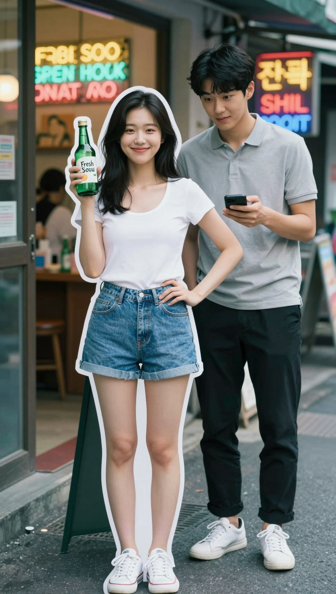 Ultra-detailed cinematic lifestyle street photography of a beautiful, cute Korean young woman with natural dark eyes and soft wavy shoulder-length black hair, smiling brightly while holding a small green glass bottle labeled in clean English text “Fresh Soju,” represented as a life-size cardboard cutout with a neat white outline, wearing a fitted white T-shirt, high-waisted blue denim shorts, and clean white sneakers, standing confidently with one hand on her hip in front of a cozy neon-lit shop entrance at night; beside the cutout stands a handsome Korean young man in a light gray polo shirt, black cropped pants, and white sneakers, leaning slightly forward with a curious amused expression while holding a smartphone casually in his hand, colorful neon signs in the background glowing in English letters only, warm indoor light mixing with cool neon reflections, shallow depth of field, soft bokeh, realistic skin and fabric texture, playful urban atmosphere, modern commercial photography style, balanced composition, cinematic color grading, professional 35mm lens look, f1.8 aperture, high dynamic range, ultra-clean rendering, 4k ultra-high resolution, masterpiece quality