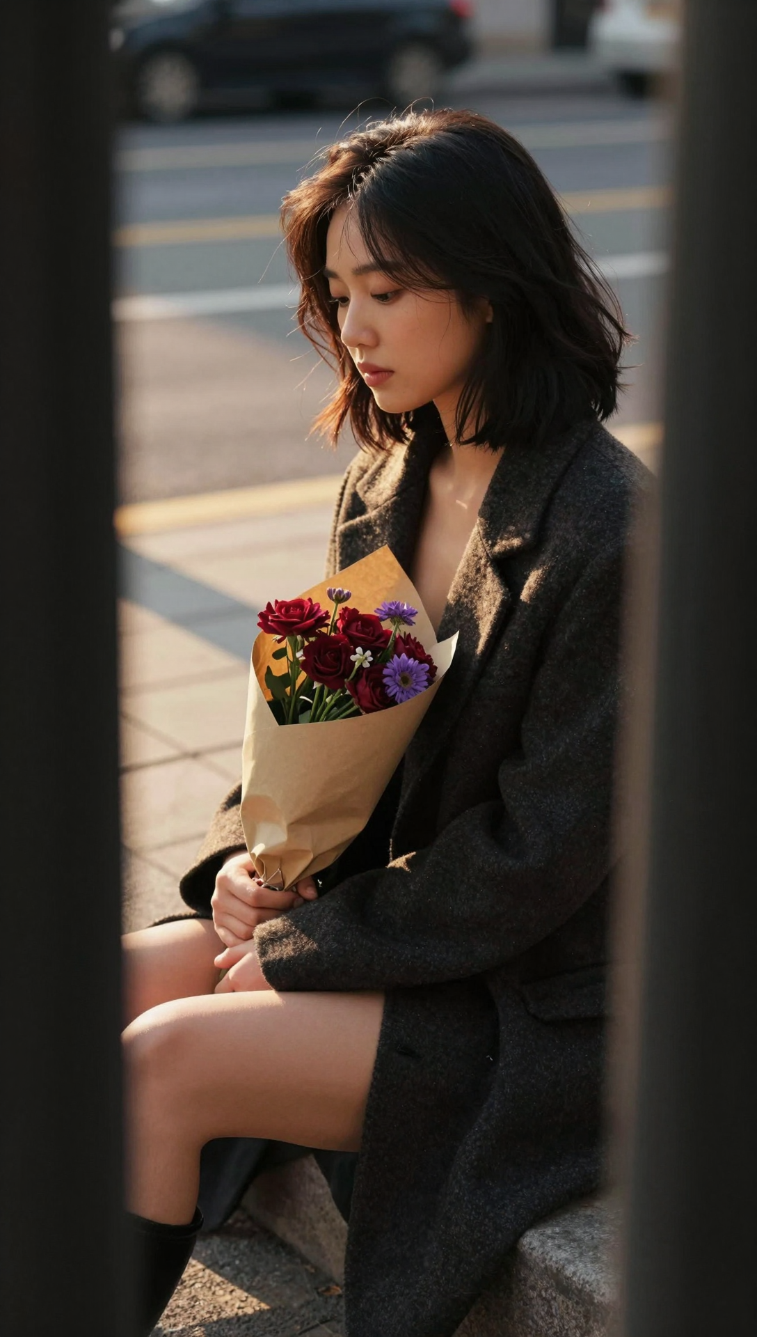 A beautiful cute Korean young woman with natural dark eyes sitting quietly on a city sidewalk at golden hour, captured in a side-profile three-quarter view through two dark vertical foreground bars creating a cinematic framing effect, holding a small bouquet of deep red and purple flowers wrapped in warm brown paper against her lap, her short softly layered dark hair gently touching her cheeks, head slightly bowed with a calm, thoughtful, and subtly melancholic expression, wearing a dark textured long coat, warm sunset light illuminating the pavement and softly outlining her hair and shoulders, long soft shadows stretching across the ground, shallow depth of field with blurred street background, rich amber color grading, realistic skin texture, minimal natural makeup, fine-art cinematic street photography style, quiet emotional atmosphere, elegant composition, intimate storytelling mood, ultra-high resolution, refined modern realism, professional masterpiece quality.
