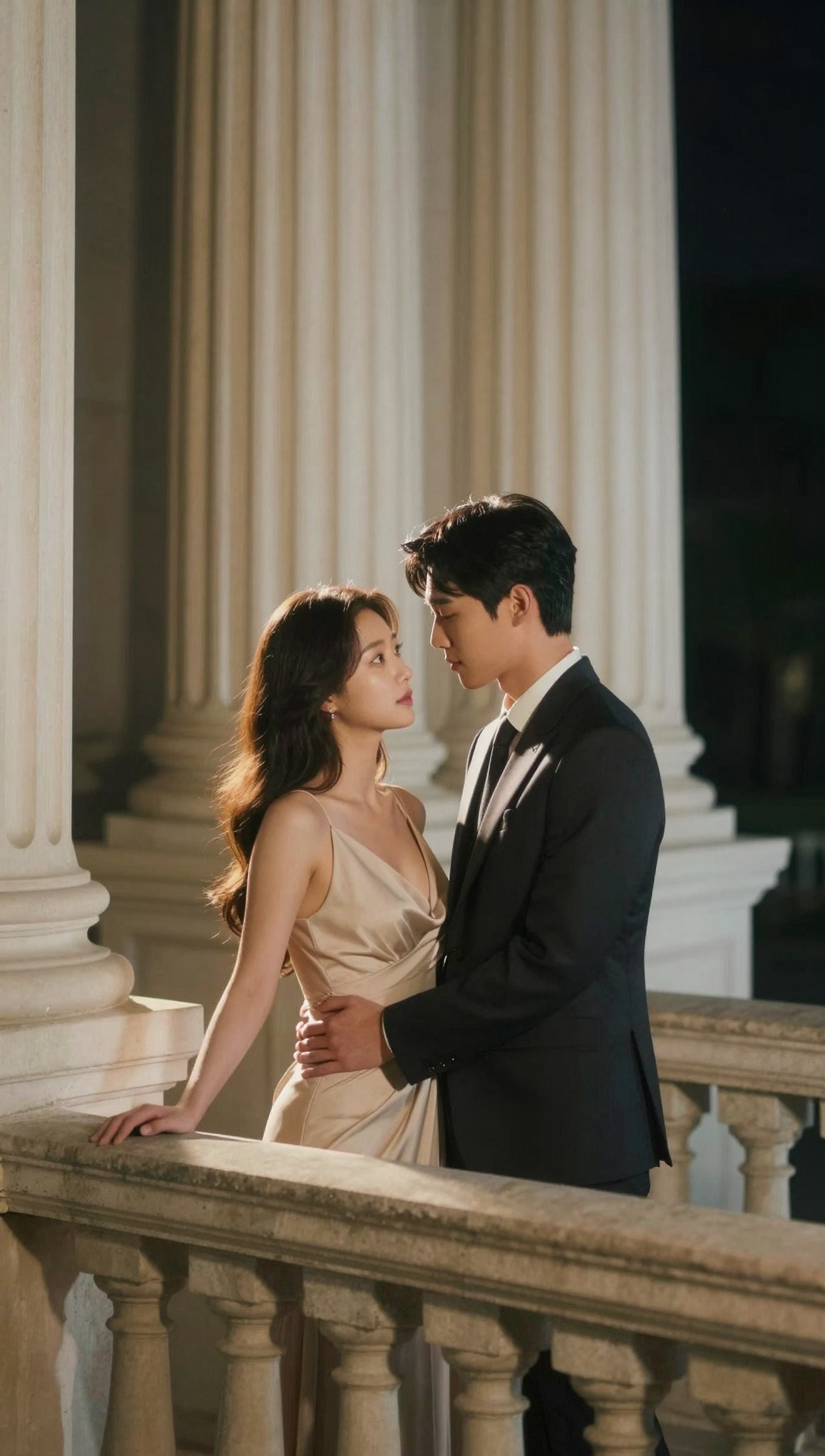 A stylish handsome Korean young man and a beautiful cute Korean young woman with natural dark eyes standing closely together on a classical stone balcony at night, the man in a dark tailored suit gently holding the woman around her waist while leaning in toward her with a tender intimate expression, the woman in an elegant light champagne evening dress with bare shoulders softly turned toward him with a calm romantic gaze, both framed by tall classical columns and ornate balustrade, warm golden spotlight illuminating only the couple while the surrounding space fades into deep shadow, dramatic high-contrast lighting with soft rim light outlining their profiles, subtle texture on stone architecture, quiet cinematic atmosphere, shallow depth of field, refined European classical mood, elegant posture and graceful body language, realistic skin tones, minimal refined makeup, soft hair highlights, cinematic fine-art romance photography style, balanced composition, poetic emotional tension, ultra-high resolution, professional masterpiece quality.