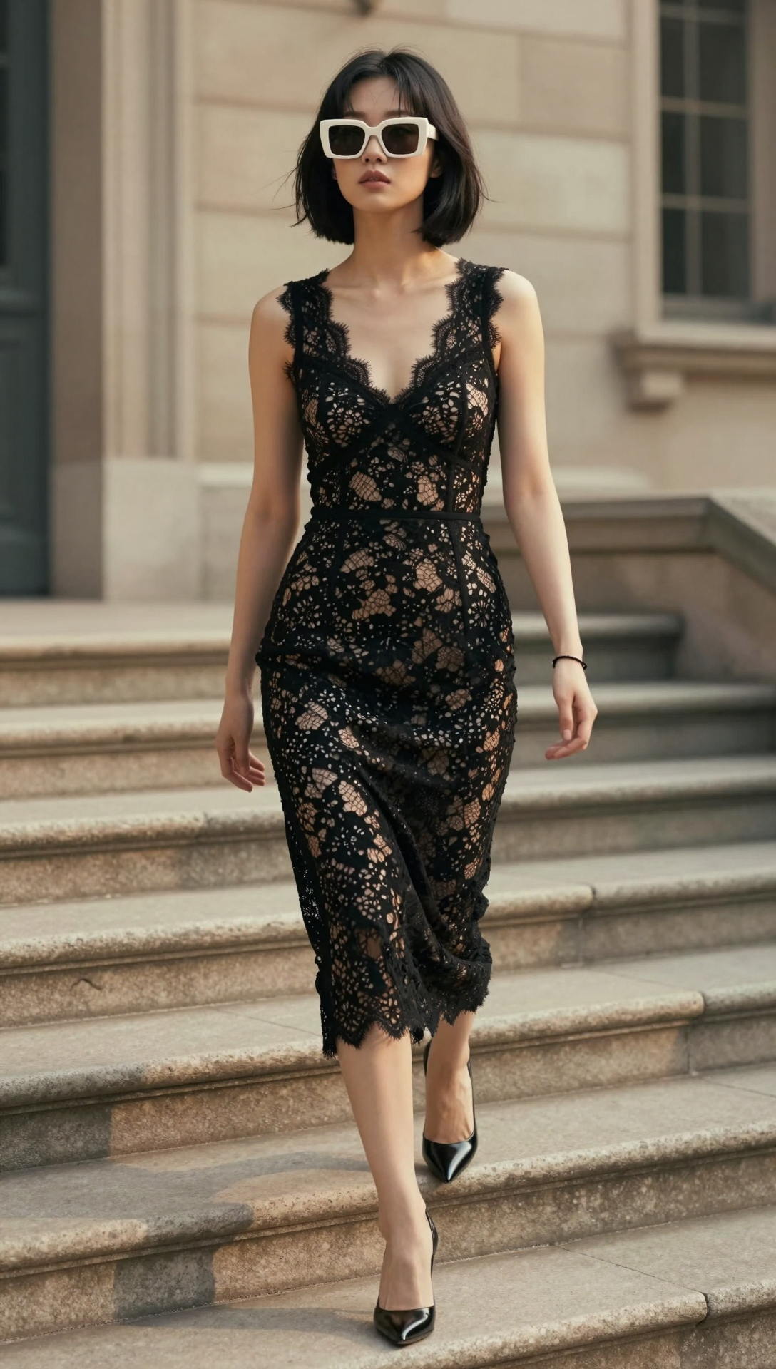 Ultra-detailed cinematic fashion editorial photography of a beautiful, cute Korean young woman with natural dark eyes and a sleek short black bob haircut, walking gracefully up classic stone steps in front of a historic beige stone building, wearing an elegant sleeveless black lace midi dress with intricate floral patterns, fitted silhouette, and subtle transparency layered over a dark inner lining, stylish white oversized square sunglasses, delicate black bracelet, and glossy black pointed high heels, calm confident sophisticated expression with chin slightly lifted, body captured in mid-step motion, warm golden-hour sunlight casting soft shadows along the steps and highlighting lace texture, shallow depth of field with architectural background softly blurred, realistic fabric and skin texture, refined luxury atmosphere, European vintage elegance mood, professional 85mm lens look, f1.8 aperture, high dynamic range, balanced composition, modern high-fashion magazine style, cinematic color grading, ultra-clean rendering, 4k ultra-high resolution, masterpiece quality