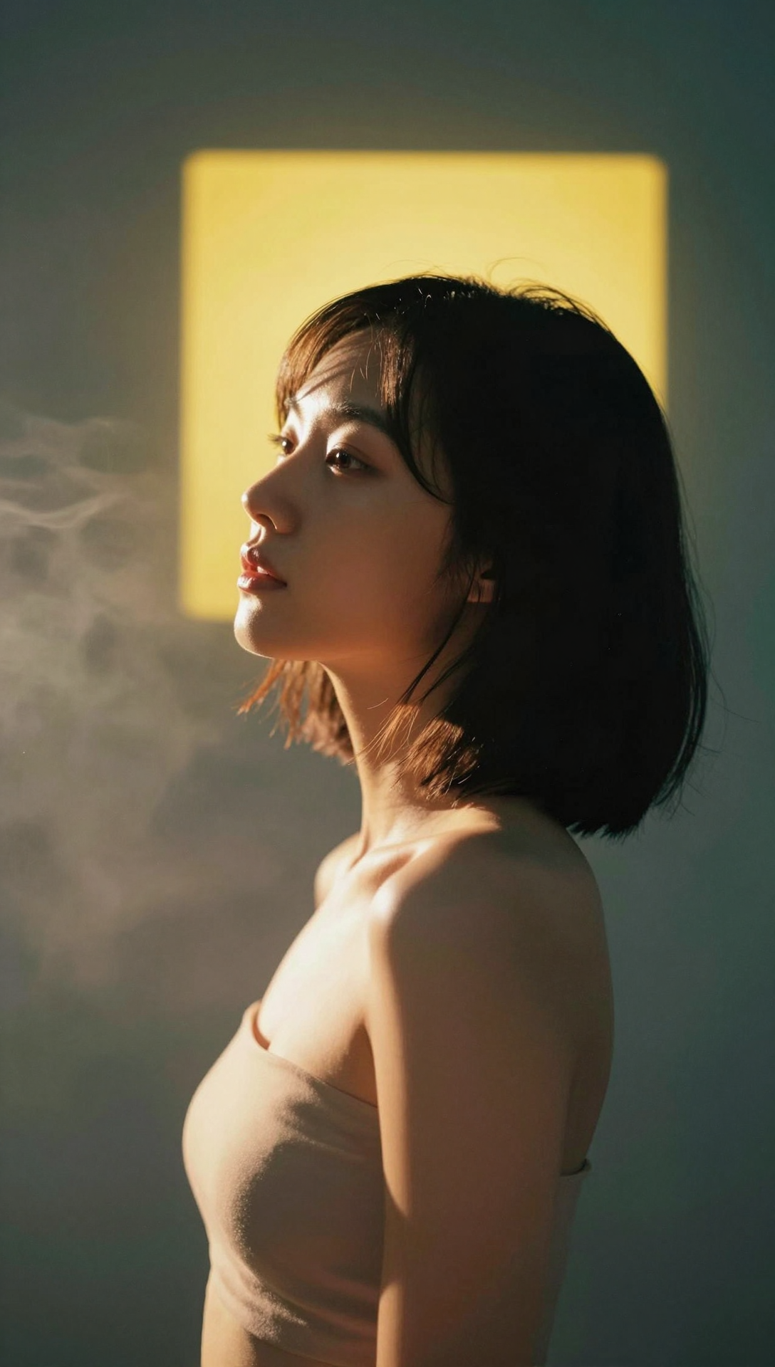 Ultra-detailed cinematic fine-art portrait of a beautiful, cute Korean young woman with natural dark eyes and sleek straight bob hair, shown in elegant side-profile silhouette with head slightly tilted upward and calm introspective expression, standing in drifting colored smoke, dramatic backlighting in warm orange and cool teal tones creating glowing rim light along her hair and jawline, large glowing yellow geometric square floating behind her in the dark background, minimalistic surreal composition, strong contrast between light and shadow, soft atmospheric haze, smooth realistic skin texture where visible, artistic color grading, emotional dreamy mood, shallow depth of field, subject sharply outlined against abstract light, professional 85mm lens look, f1.8 aperture, high dynamic range, fine art photography style, modern conceptual aesthetic, 4k ultra-high resolution, masterpiece quality, perfectly balanced composition
