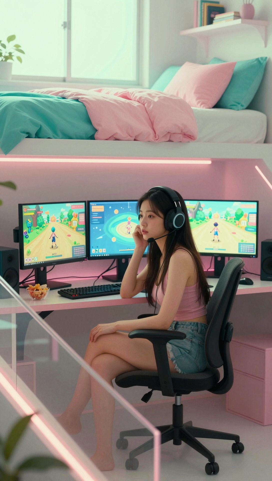 Uloft bedroom and gaming room, perfectly smooth surface with no texture or grain, flat clean cartoon shading, thin soft lineart, vibrant neon pastel colors with slightly increased saturation, high-key soft indoor glow; upper level platform bed with teal bedding, pink blanket, pastel pillows, soft LED strip lighting along walls and shelves, minimal decor items and books neatly arranged, large window glowing mint green light; lower level gaming setup with a beautiful, cute Korean young woman with natural dark eyes and long straight dark hair wearing a gaming headset, sitting in a modern black chair at a curved dual-monitor desk, colorful cartoon game displayed on screens with English UI only, keyboard, mouse, small snack bowl, compact speakers, tidy desk layout; transparent glass railing with pink neon edges, glowing staircase with embedded light strips, balanced vertical composition, cozy futuristic atmosphere, youthful tech lifestyle mood, no realism influence, no photographic lighting, no 3D rendering feel, pure cartoon illustration quality, ultra-smooth rendering, elegant modern cartoon style, professional 4k masterpiece quality