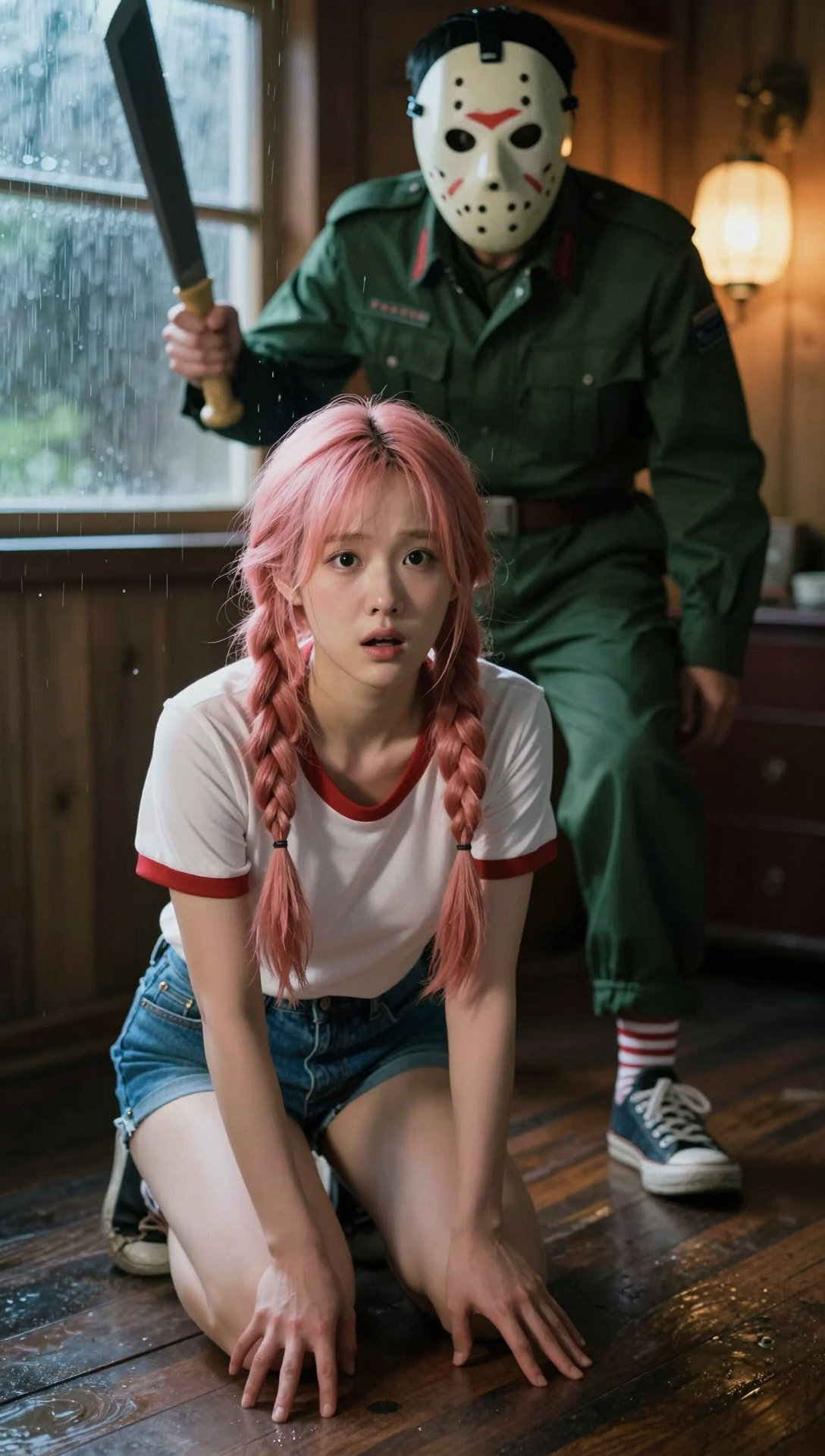 Ultra-detailed cinematic horror scene photography of a beautiful, cute Korean young woman with natural dark eyes and pastel pink twin-braid hair, kneeling on a dark wooden cabin floor in a tense frightened pose, wearing a white vintage-style T-shirt with red trim and blue denim shorts, striped socks and sneakers, mouth slightly open in shocked fear while staring directly at the camera, hands pressed to the floor, shallow breathing posture; behind her stands a tall masked Korean young man in a dark green military-style jacket and pants, wearing a classic white hockey-style horror mask, holding a large machete upright in one hand without motion, body partially in shadow, rain streaking down a small window in the background, warm cabin wall lamp casting soft amber light contrasting with cool blue rain light, strong cinematic lighting separation, shallow depth of field, dramatic tension atmosphere, realistic wood texture and fabric detail, subtle film grain, horror movie still aesthetic, professional 35mm lens look, f1.8 aperture, high dynamic range, perfectly balanced composition, intense suspense mood, modern cinematic realism, 4k ultra-high resolution, masterpiece quality