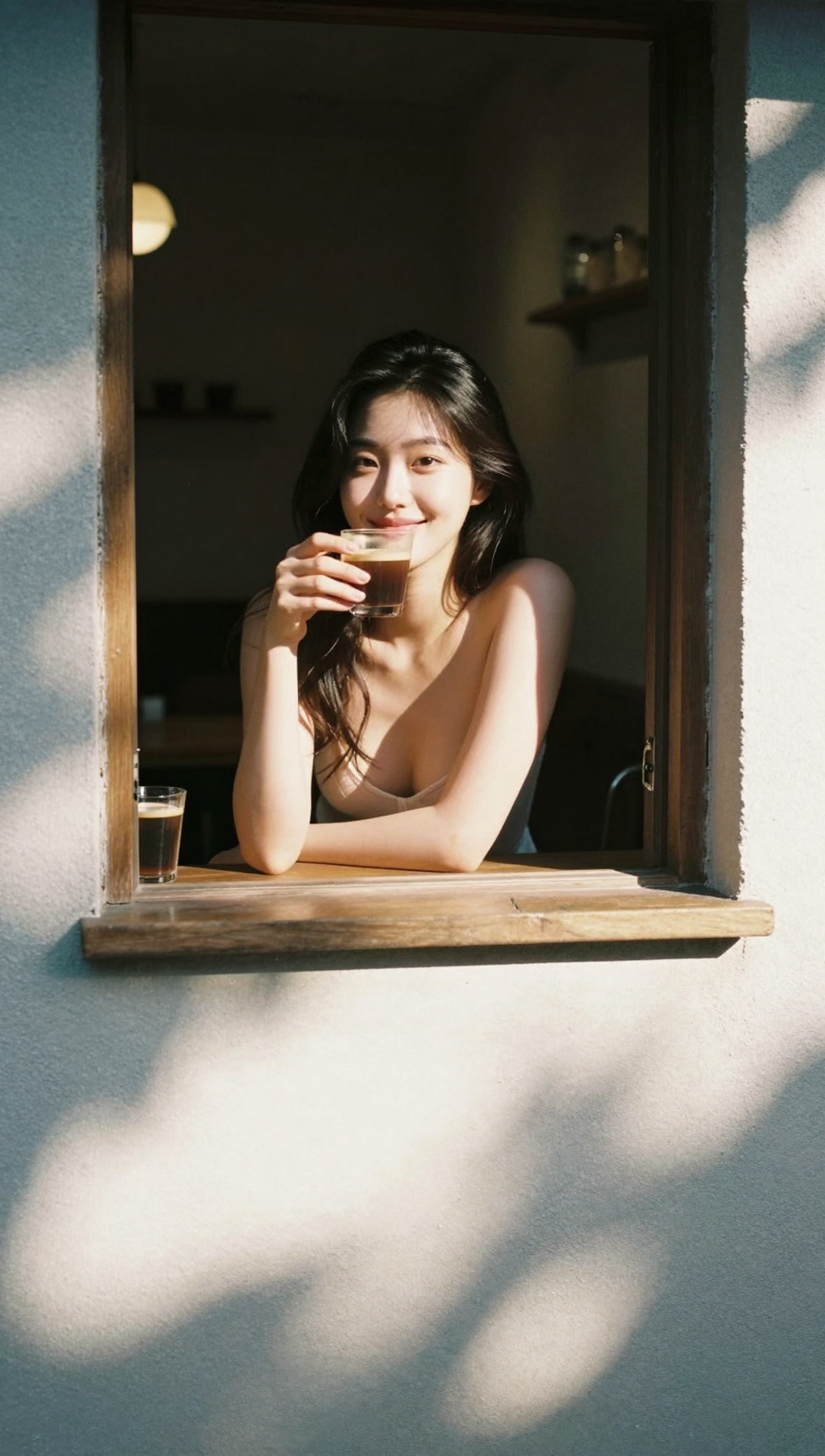 photograph with shallow depth of field. A single hard, directional light source strikes from one side, producing intense highlights and deep, sharply defined shadows with rapid falloff. No fill light is present. A small European coffee shop exterior is shown, featuring a recessed window set into a textured wall. Inside the window, a young naked woman is visible from the upper torso upward. She drinks her coffee and quietly contemplating the meaning of life, smiling to herself in thought. Her bare shoulders and upper torso are visible above the window ledge. The side light illuminates her eyes and facial features, while the interior space behind her remains dark. Long shadows fall across the exterior wall, indicating the sun is low in the sky near the end of the day