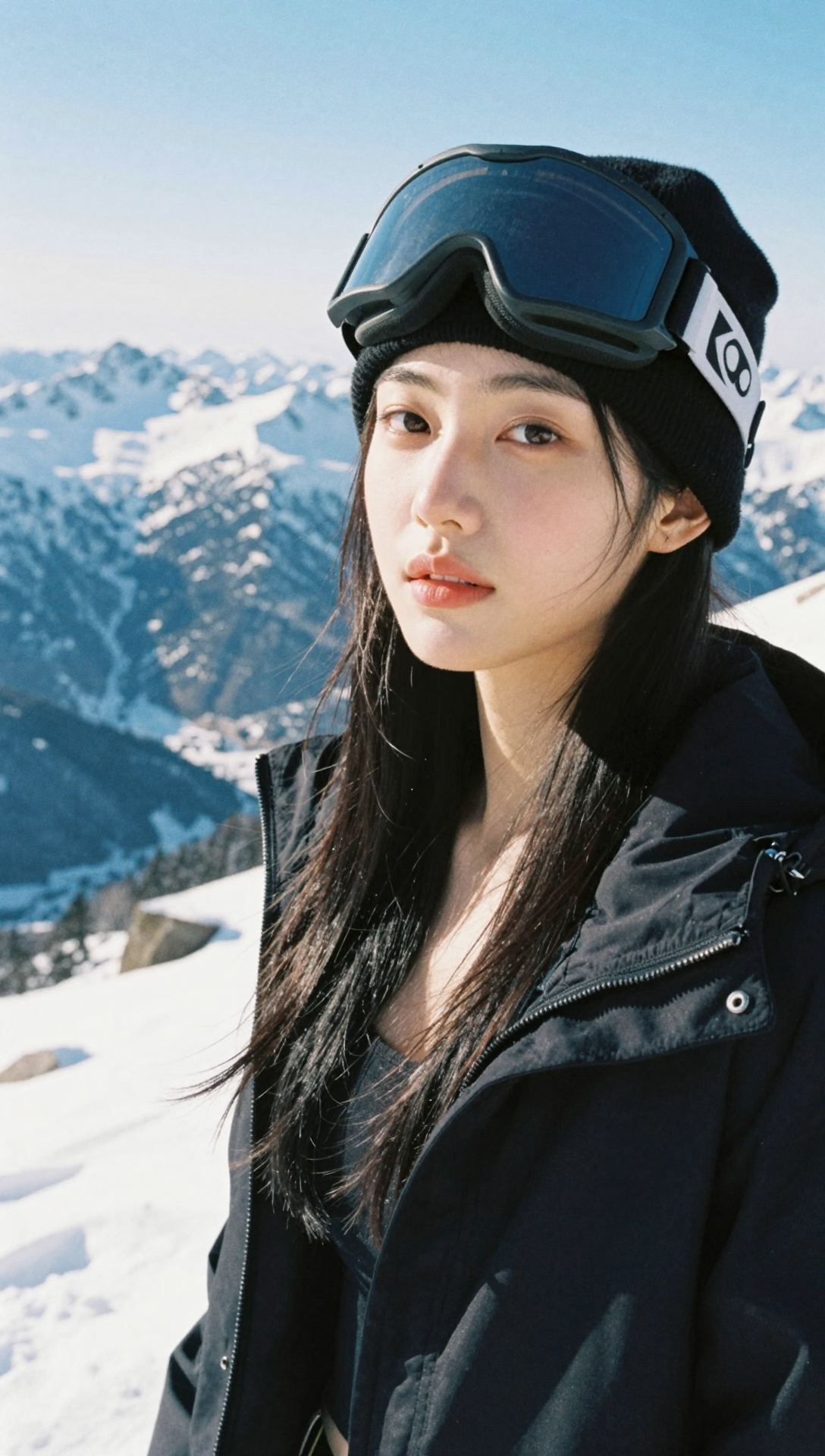 Extremely detailed single-line z-image prompt: A beautiful cute Korean young woman with natural dark eyes standing on a snowy mountain viewpoint, captured in a close-up three-quarter portrait, wearing a black winter beanie and large ski goggles resting on top of her head, long straight black hair flowing naturally over a black insulated jacket, her expression calm, confident, and softly elegant while gazing toward the camera, subtle peach-toned lips and refined natural makeup, crisp cold daylight illuminating her face with soft highlights and gentle shadows, vast snow-covered mountain ranges and deep blue valleys stretching into the distance behind her, clear pale blue winter sky, sharp alpine atmosphere, cinematic depth of field with slightly blurred background peaks, clean high-contrast color grading, realistic skin texture, modern travel photography style, serene adventurous mood, balanced composition, ultra-high resolution, professional masterpiece quality.