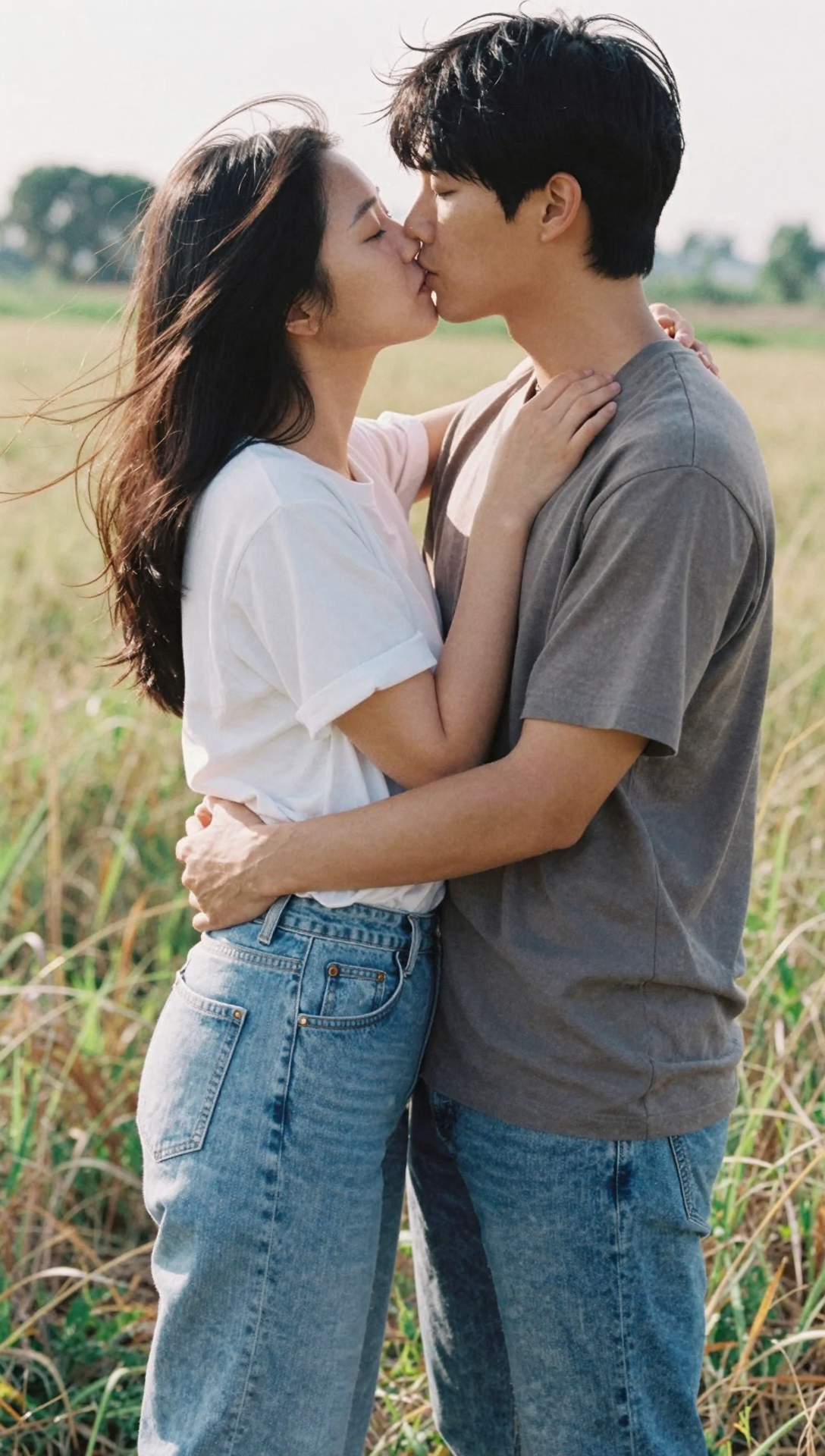 Extremely detailed single-line z-image prompt: A stylish handsome Korean young man and a beautiful cute Korean young woman with natural dark eyes sharing a gentle kiss in the middle of a sunlit open field, captured in a vertical three-quarter medium-full view, the woman wearing a loose white short-sleeve T-shirt and light blue denim jeans with her arms softly wrapped around his neck, the man wearing a casual muted gray short-sleeve shirt and jeans with one arm around her waist, their eyes closed with tender affectionate expressions, soft summer breeze lifting strands of their hair, tall golden grass surrounding them, distant trees softly blurred on the horizon, warm natural sunlight illuminating their faces and shoulders, subtle film-like softness with gentle contrast, shallow depth of field, realistic skin texture, minimal natural makeup, nostalgic countryside romance photography style, quiet intimate atmosphere, poetic youthful mood, balanced composition, ultra-high resolution, refined modern realism, professional masterpiece quality.
