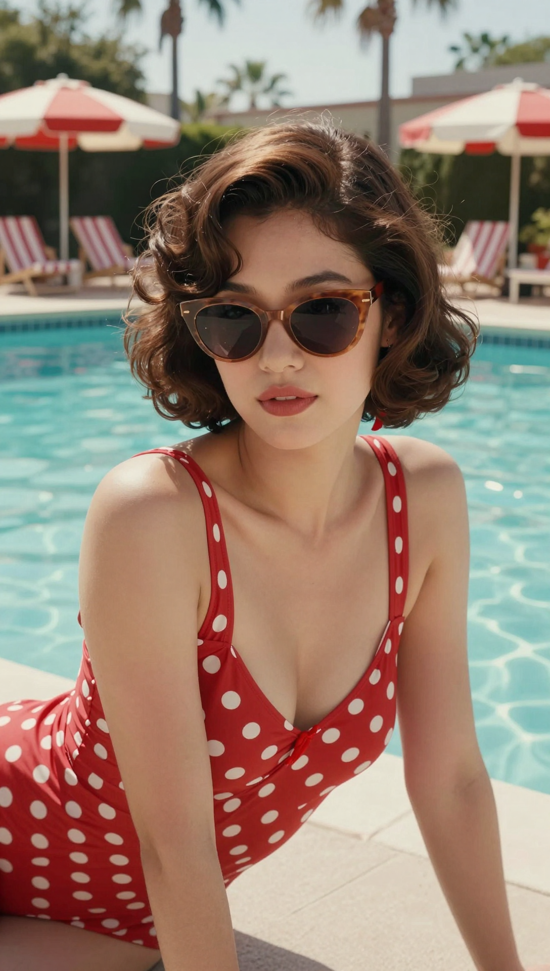 This is a VORTEXULTRAFOCUST7 style image in 3D, CGI, semi-realism look.A semi-realistic close-up illustration 1girl, sun-drenched 1960s retro pool scene in Los Angeles, playful brunette woman lounging by a turquoise swimming pool, short wavy chestnut-brown bob haircut, glossy curls framing her face, wearing a classic red polka-dot vintage swimsuit, red ribbon tied into her hair, oversized sixties-style sunglasses framing her face, relaxed playful pose, confident smile, warm sunlit skin bold red-and-white striped deckchairs and umbrellas scattered around the pool, shimmering turquoise water with bright light reflections, tall palm trees gently swaying in the background, clear California sky, mid-century modern resort atmosphere