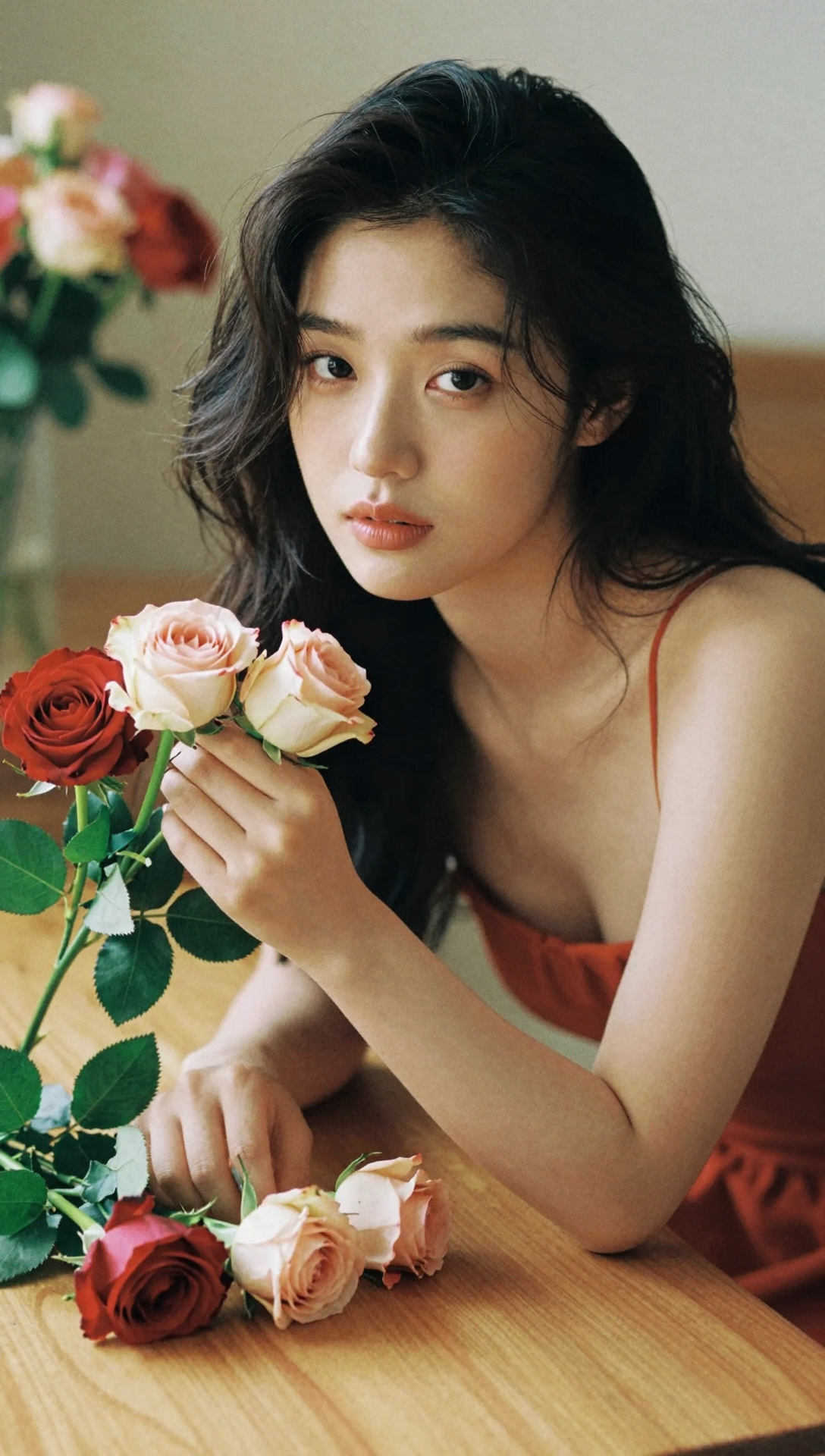 A beautiful cute Korean young woman with natural dark eyes leaning slightly forward over a light wooden table while gently holding a small bouquet of red and pale cream roses with green leaves, long softly wavy dark hair framing her face with smooth natural flow, her gaze intense yet calm and tender as she looks directly into the camera, lips softly parted with a natural satin finish, wearing a minimalist red inner top partially visible at the shoulders in a tasteful and elegant way, soft diffused indoor daylight illuminating her face and hands, warm cozy interior with blurred flower arrangements and wooden furniture in the background, shallow depth of field, crisp focus on eyes and flowers, realistic skin texture, refined minimal makeup, gentle highlights along hair and nose bridge, romantic fine-art portrait photography style, balanced warm color grading, intimate poetic mood, clean composition, ultra-high resolution, elegant modern realism, professional masterpiece quality.
