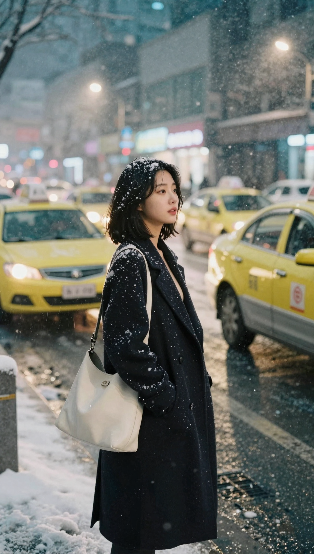 A beautiful cute Korean young woman with natural dark eyes standing with her back to the camera on a snowy city street at night, wearing a long dark winter coat and carrying a soft white shoulder tote bag, short softly layered dark hair gently dusted with falling snow, her posture quiet and contemplative as she looks toward a row of yellow taxis parked along the street, warm shop lights glowing through snowy air, colorful neon signage softly blurred in the background, thick snowflakes drifting diagonally across the scene, wet pavement reflecting streetlights and car lights, cinematic shallow depth of field, rich teal-and-amber color grading, realistic winter atmosphere, subtle rim light outlining her silhouette, fine-art urban night photography style, emotional solitude mood, balanced composition, ultra-high resolution, refined modern realism, professional masterpiece quality.