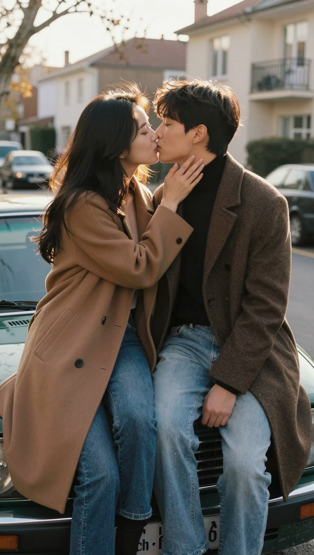 A stylish handsome Korean young man and a beautiful cute Korean young woman with natural dark eyes sharing a gentle kiss while sitting closely on the hood of a vintage dark green classic car parked on a quiet European residential street in late autumn, the man seated sideways on the hood with one knee raised wearing a brown textured wool coat over a black turtleneck and light blue relaxed-fit jeans, the woman leaning in between his legs wearing a long camel-brown coat over a simple inner top and fitted blue jeans, her right hand softly holding his jaw and her left arm wrapped around his waist, their eyes closed with tender affectionate expressions, warm golden afternoon sunlight filtering through leafless tree branches, soft backlight creating glowing hair edges, subtle breeze lifting loose strands of hair, cream-colored buildings with balconies and parked cars softly blurred in the background, shallow depth of field, cinematic 50mm lens look, natural skin tones, minimal refined makeup, gentle color grading with warm highlights and soft shadows, intimate romantic atmosphere, elegant modern realism, ultra-high resolution, professional cinematic masterpiece quality.