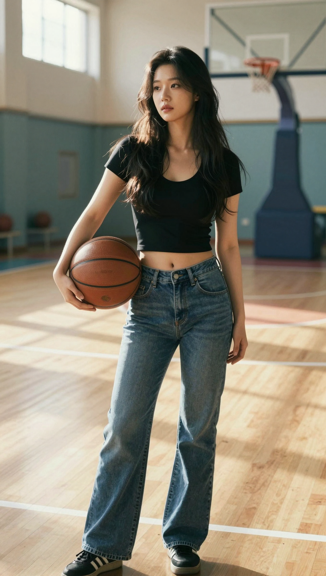 A beautiful cute Korean young woman with natural dark eyes standing confidently on an indoor basketball court, captured in a three-quarter full-body view, holding a basketball naturally against her right hip with a relaxed athletic posture, wearing a fitted black cropped T-shirt, high-waisted blue denim jeans, and subtle black sneakers, long softly wavy dark hair flowing over her shoulders with gentle movement, her gaze turned slightly to the side with a calm focused and thoughtful expression, warm sunlight streaming through high gym windows creating soft highlights on her hair and arms and clean shadows on the polished wooden floor, basketball hoop and backboard softly blurred in the background, shallow depth of field, realistic skin texture, minimal sporty makeup, modern lifestyle sports fashion photography style, balanced composition, natural warm color grading, youthful confident mood, ultra-high resolution, refined cinematic realism, professional masterpiece quality.