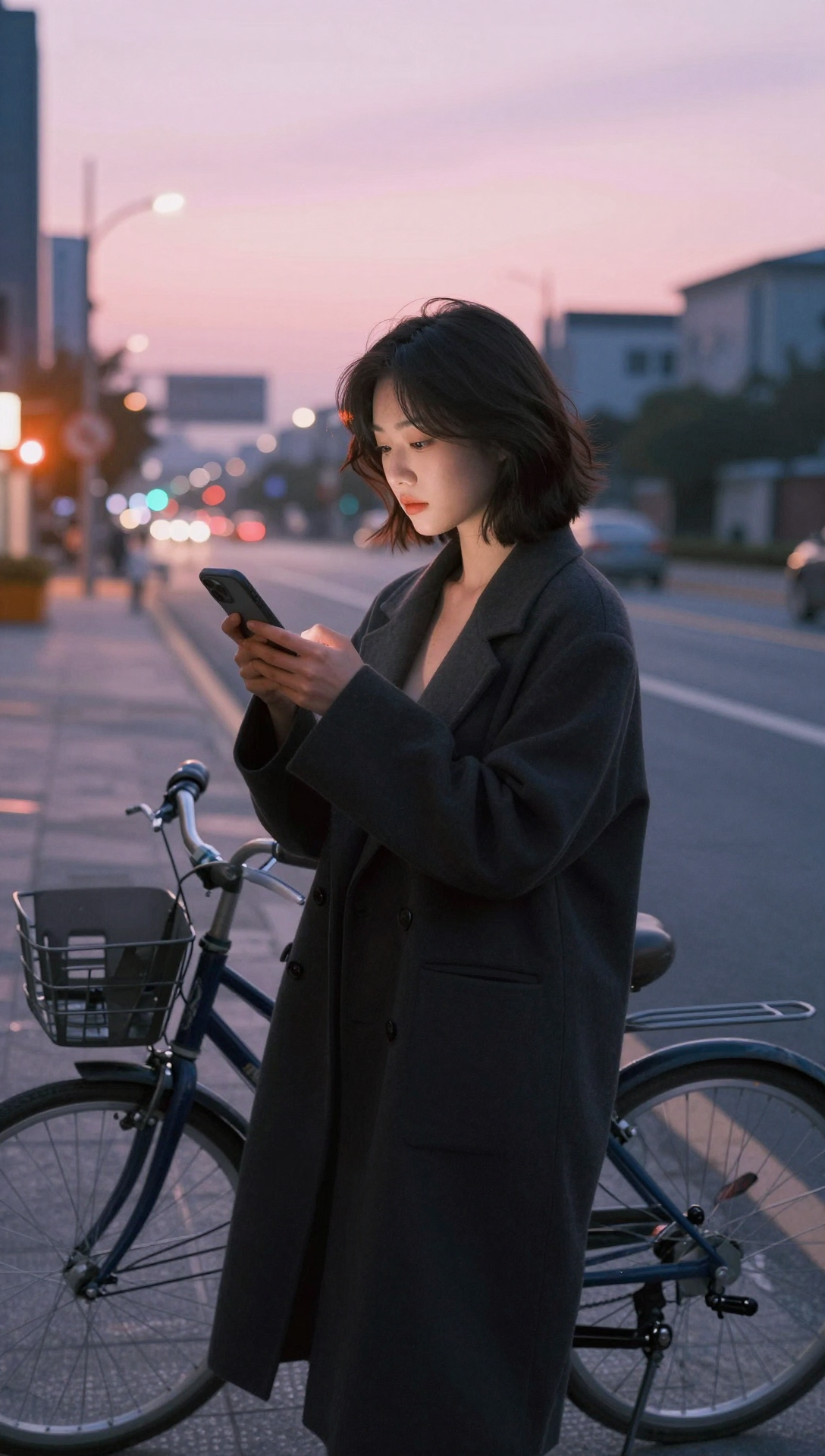 A beautiful cute Korean young woman with natural dark eyes standing beside two parked city bicycles on a quiet urban sidewalk at dusk, captured in a medium full-body side profile view, wearing an oversized dark coat with her short softly layered dark hair gently framing her face, calmly looking down at her smartphone with a focused, peaceful expression, warm orange light flare softly bleeding in from the left foreground, pastel pink and purple twilight sky above, distant city buildings and streetlights forming soft bokeh in the background, long empty road stretching into depth, gentle reflections on pavement, shallow depth of field, cinematic warm-to-cool color grading, realistic skin texture, minimal natural makeup, modern street photography style, quiet contemplative atmosphere, elegant urban mood, balanced composition, ultra-high resolution, refined modern realism, professional masterpiece quality.