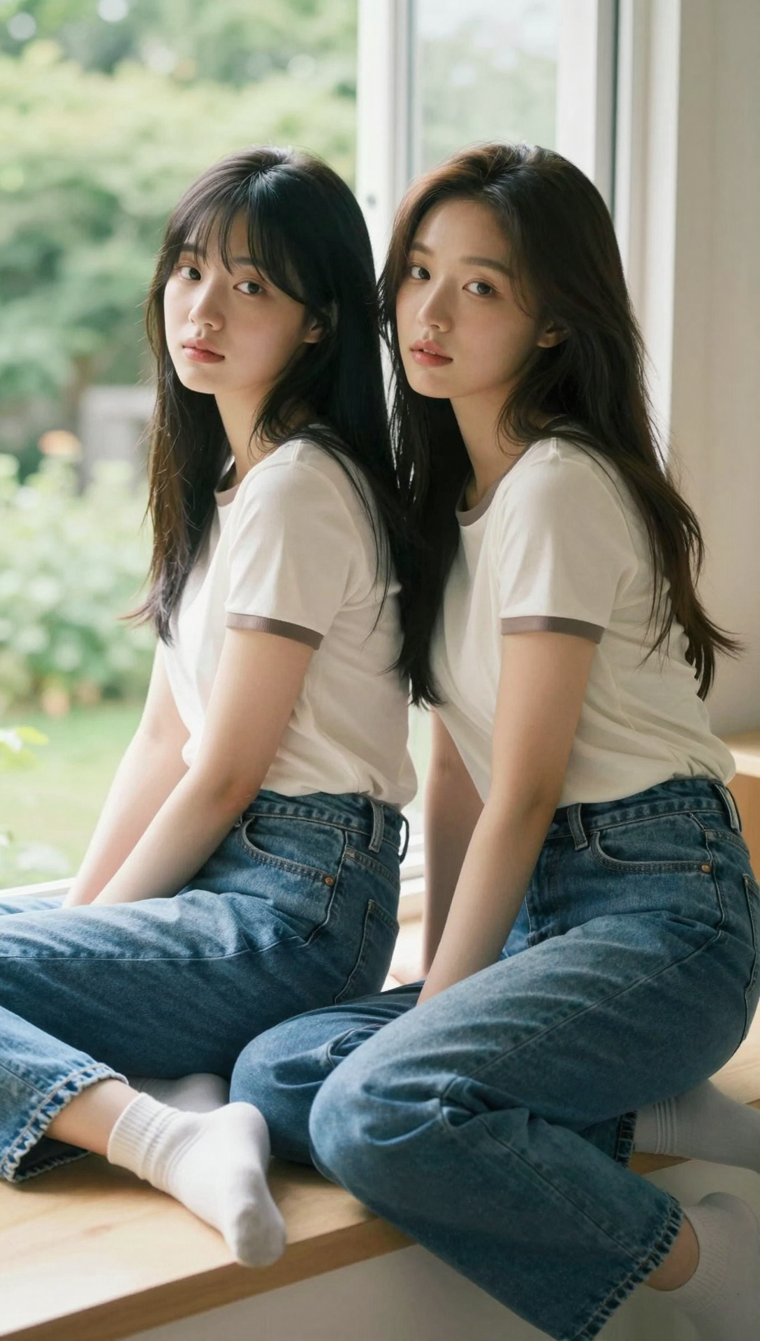 Two beautiful cute Korean young women with natural dark eyes sitting closely side by side on a window ledge in a cozy bright room, captured from a gentle rear three-quarter angle as both turn their heads back toward the camera with soft, calm, and slightly curious expressions, one with straight black hair and bangs, the other with long softly flowing dark brown hair, both wearing simple fitted short-sleeve cream T-shirts with subtle brown trim and high-waisted blue denim jeans, relaxed casual posture with one pair of socked feet resting playfully on the window frame, soft natural daylight streaming through green trees outside, blurred garden background with fresh summer atmosphere, shallow depth of field, clean skin texture, minimal natural makeup, warm neutral color grading, lifestyle friendship portrait photography style, intimate but wholesome mood, balanced composition, gentle highlights and soft shadows, ultra-high resolution, refined modern realism, professional masterpiece quality.