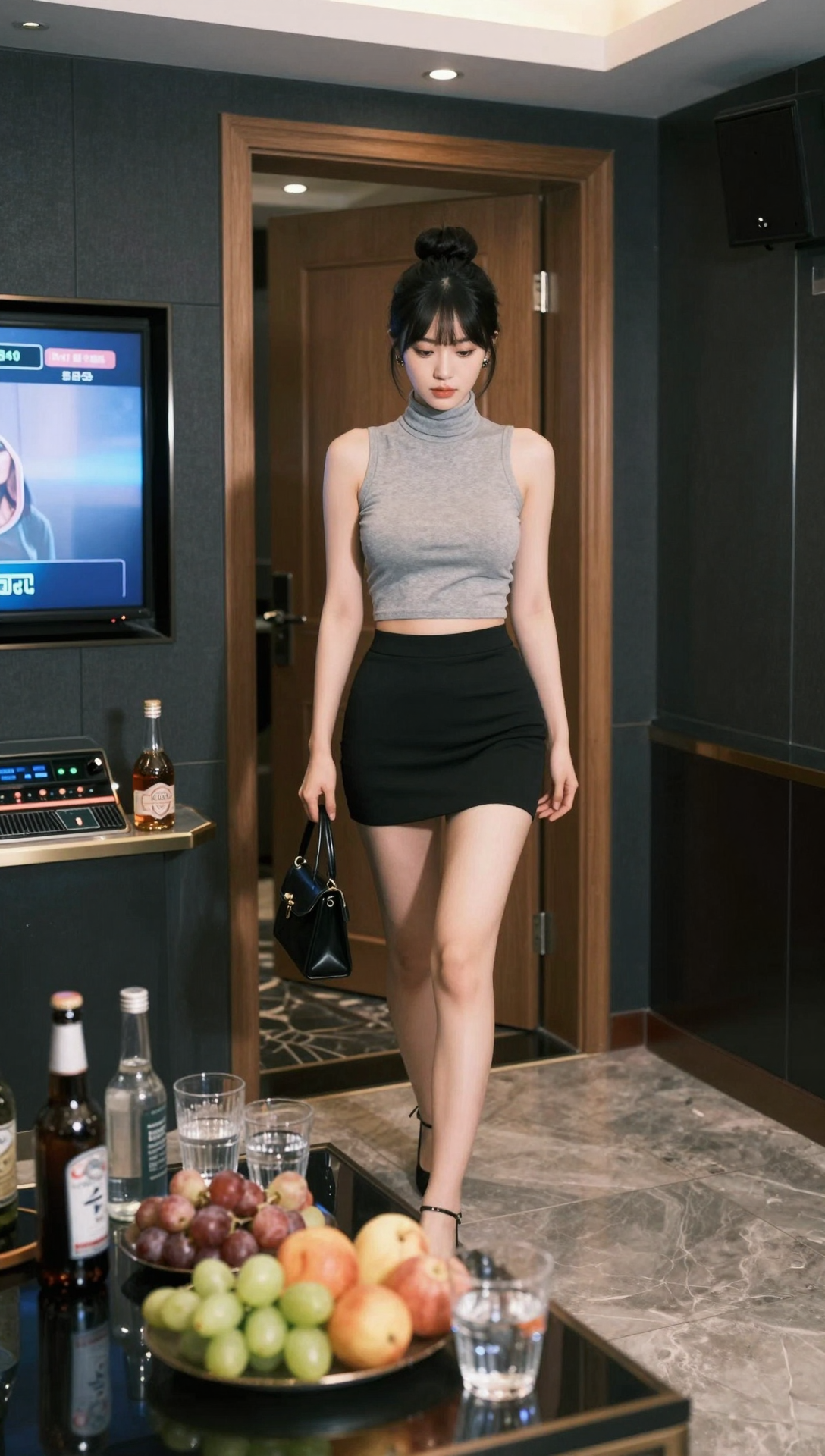 Ultra-detailed cinematic karaoke room portrait of a stylish young Korean woman with natural dark black eyes and clear smooth skin, soft black hair tied in a neat high bun with light bangs, wearing a fitted gray sleeveless turtleneck crop top, high-waisted black mini skirt, and elegant black heels, walking confidently through a wooden door while holding a small black handbag, modern private karaoke room interior with large flat-screen TV, professional karaoke console, dark acoustic walls, soft warm ceiling lighting, table in foreground filled with neatly arranged fresh sliced fruits, glass cups, beer bottles, and a whisky bottle, balanced wide-angle composition, subtle reflections on glass surfaces, realistic fabric texture, soft shadow gradients, cinematic nightlife atmosphere, shallow depth of field, 35mm lens look, elegant Korean nightlife fashion aesthetic, ultra-clean high-resolution 4k masterpiece quality, no visible text, no logos, no watermarks.