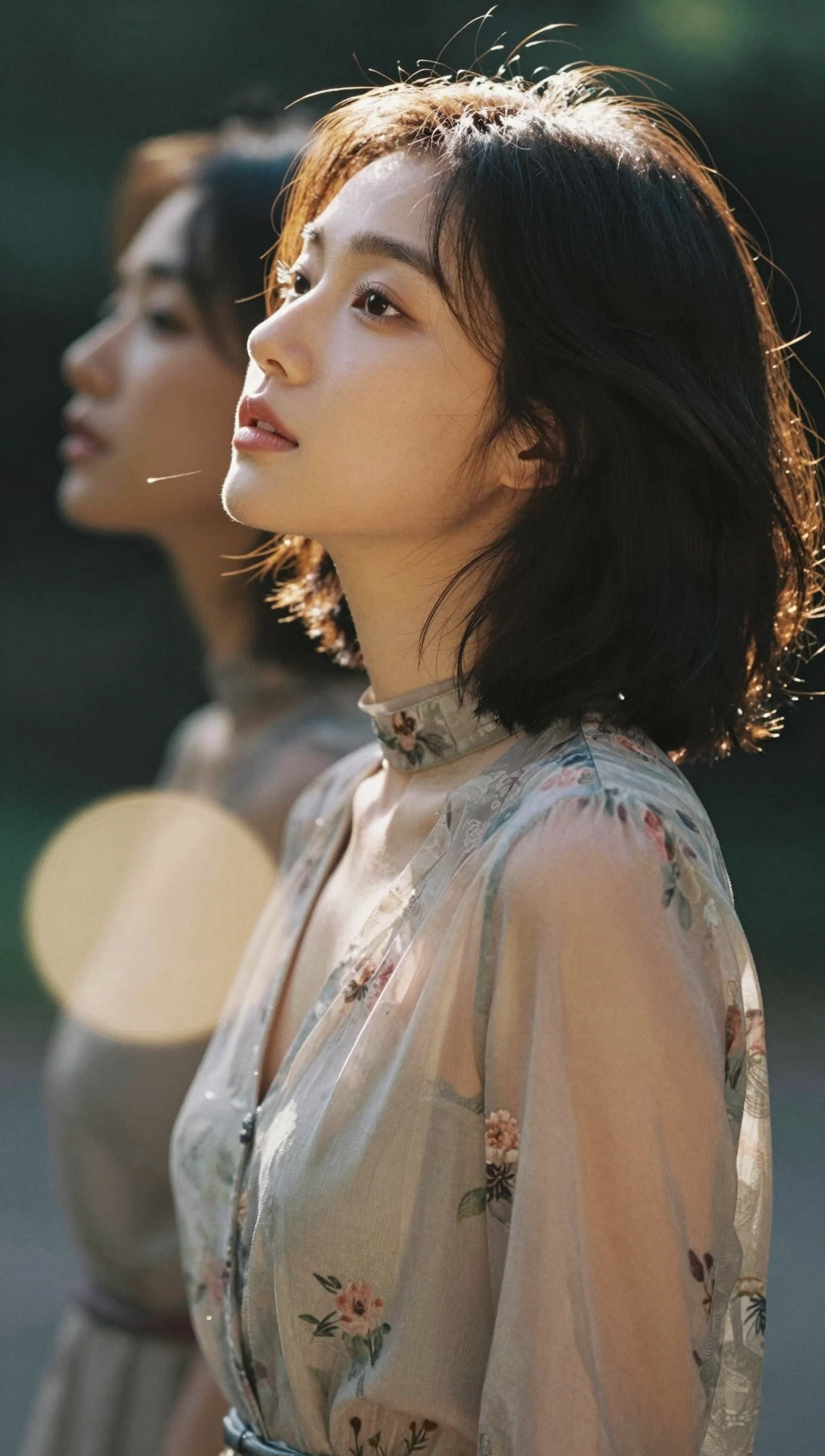 A beautiful cute Korean young woman with natural dark eyes shown in an elegant side-profile portrait facing upward, short softly tousled bob hair illuminated by warm rim light with delicate flyaway strands glowing, wearing a sheer high-neck floral chiffon blouse in muted earthy pastel tones, her expression calm, thoughtful, and quietly emotional, strong cinematic backlight outlining her face, nose bridge, lips, and hair, large soft circular golden bokeh lights floating in the foreground, subtle mirrored double profile reflection behind her creating a poetic layered composition, deep dark background, shallow depth of field, smooth realistic skin texture, minimal natural makeup, gentle highlight on eyelashes and cheekbone edge, warm golden color grading, fine-art cinematic portrait photography style, dreamy atmospheric mood, refined contrast, ultra-high resolution, intimate artistic elegance, professional masterpiece quality.