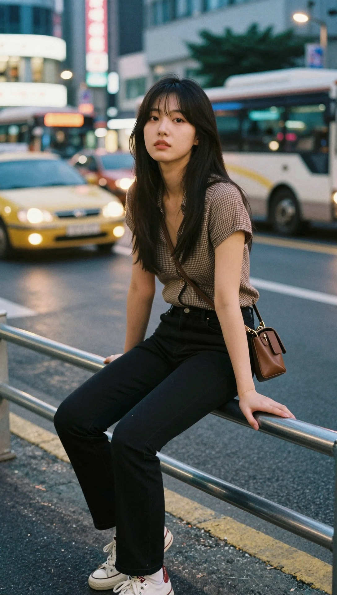 Beautiful cute Korean young woman with natural dark black eyes sitting casually on a metal roadside railing at a lively city intersection at night, long straight dark hair with soft bangs framing her face, wearing a short-sleeve brown checkered blouse tucked into slim black pants, white sneakers with red accents, small brown crossbody bag resting at her hip, relaxed slightly melancholic expression with calm thoughtful gaze directed toward the camera, one hand resting lightly on the railing and the other hanging naturally, colorful city traffic and buses moving behind her with soft motion blur, neon shop signs and street lights glowing in the background with English signage only, modern urban buildings softly blurred, warm street lighting mixed with cool neon reflections creating cinematic contrast, realistic skin texture with gentle glow, fine hair strands individually visible, shallow depth of field, professional night street portrait photography style, 50mm lens look, balanced vertical composition, urban solitude and youthful city mood, cinematic color grading, ultra-high resolution 4k masterpiece quality, no visible logos, no Korean or Japanese text, refined modern urban aesthetic.