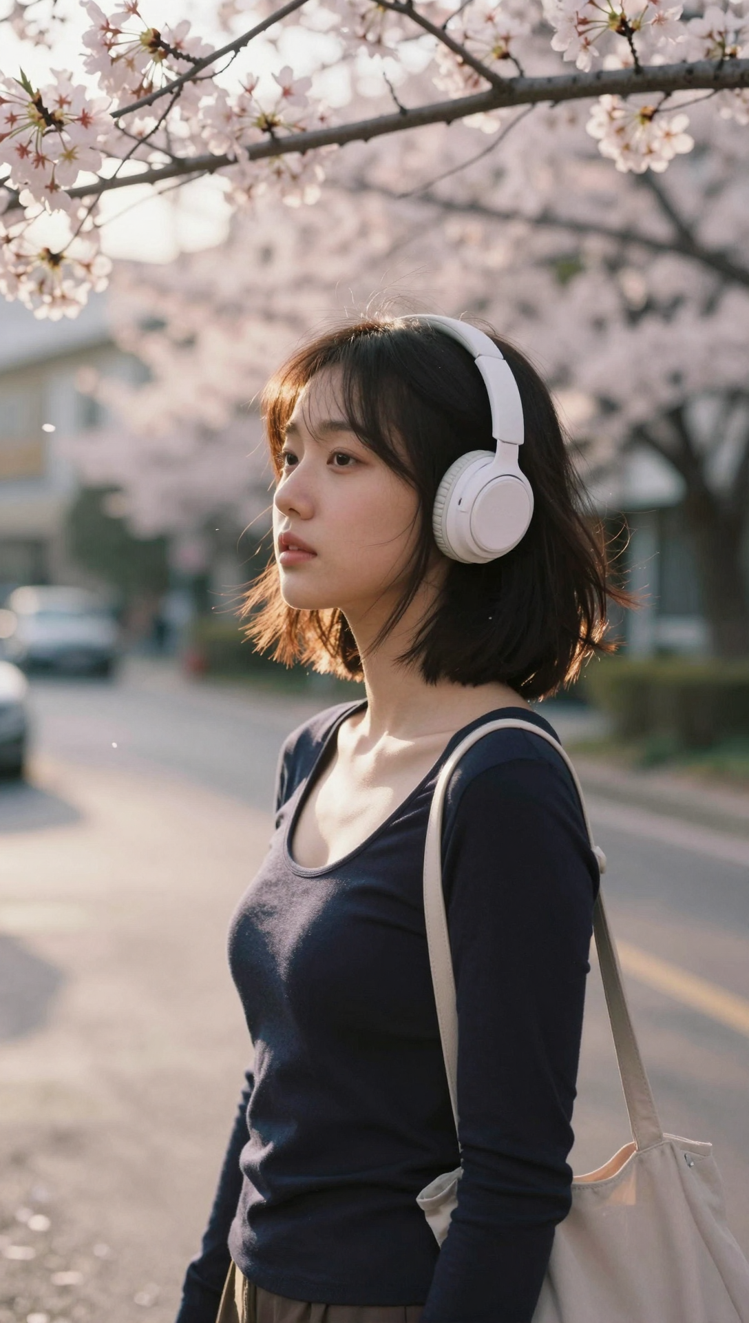 A beautiful cute Korean young woman with natural dark eyes walking quietly beneath blooming cherry blossom branches at golden hour, captured in a soft side-profile medium shot, wearing white over-ear headphones, a simple dark long-sleeve top, and a light shoulder bag strap crossing her body, her short softly layered dark hair gently framing her face, expression calm, introspective, and peaceful, delicate cherry blossom petals drifting slowly through the warm backlit air, sunlight filtering through pale pink blossoms creating glowing highlights and soft bokeh, long soft shadows on the ground, blurred campus-style buildings in the background, shallow depth of field, warm amber and pastel color grading, realistic skin texture, minimal natural makeup, fine-art cinematic spring street photography style, quiet emotional atmosphere, poetic seasonal mood, elegant composition, ultra-high resolution, refined modern realism, professional masterpiece quality.
