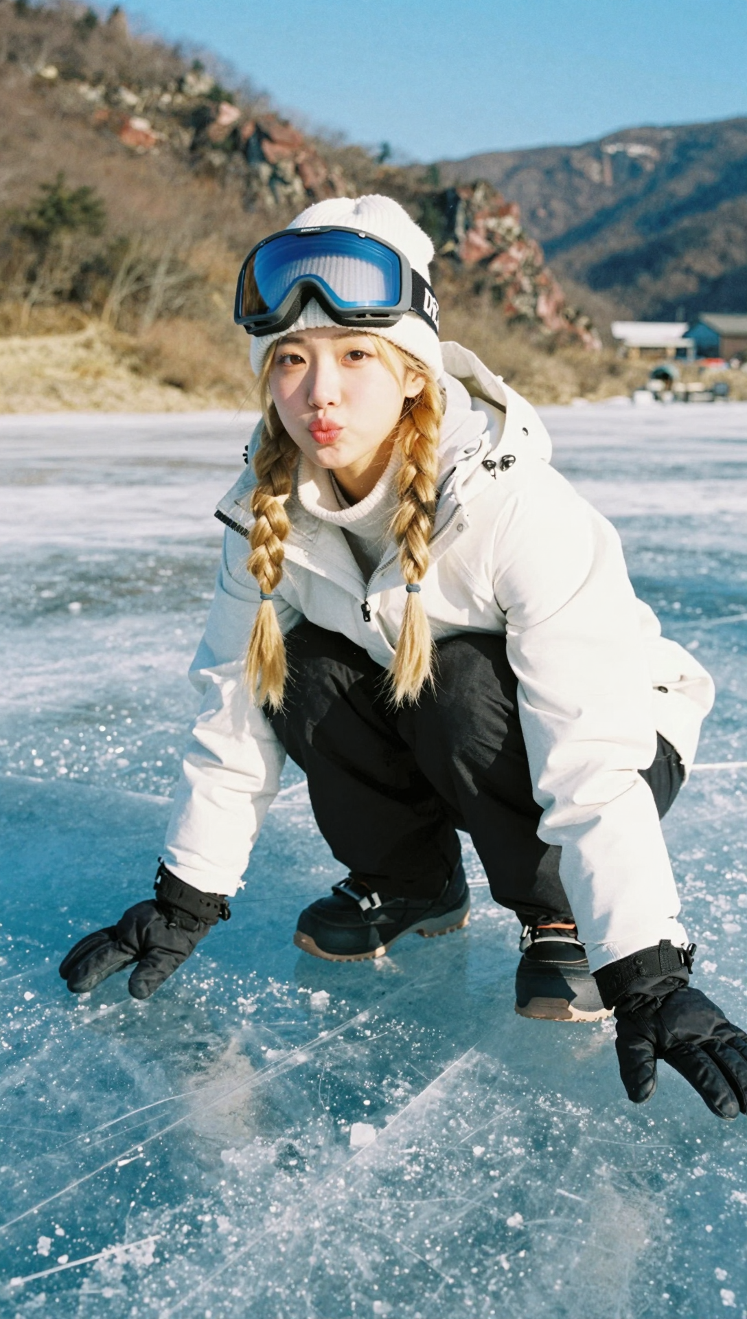 A beautiful cute Korean young woman with natural dark eyes and long blonde-toned hair styled into two neat braids crouches playfully on a crystal-clear frozen lake, wearing a white knit beanie, reflective blue ski goggles, a thick white winter jacket, black snow pants, and insulated gloves, her lips gently puckered in a playful expression, gaze directed toward the camera through the tinted goggles, captured at close eye-level with a wide-angle perspective, bright winter sunlight illuminating the icy surface with sharp sparkling highlights and deep transparent cracks beneath her feet, rugged reddish rock cliffs rising in the background under a clear blue sky, crisp cold atmosphere, strong depth and clarity, clean color balance, vibrant contrast, modern outdoor adventure photography style, energetic youthful mood, elegant natural realism, ultra high resolution, professional 4k masterpiece quality