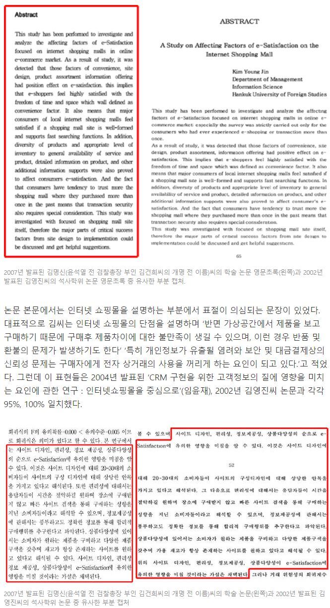 야권 유력 대선주자인 윤석열 전 검찰총장 부인 김건희씨의 박사학위 논문 표절 의혹에 대해 국민대가 검증에 들어간 가운데 김씨가 2007년 발표한 또 다른 학회 논문의 표절률도 30%가 넘는 것으로 확인됐다. 특히 이 논문 영문초록의 경우 비슷한 주제로 2002년 발표된 다른 논문의 영문 초록과 94% 일치했다. 한 문장을 제외하고 사실상 모두 같았다. 박사학위 논문과 ‘온라인 운세’를 다룬 학술논문에 이어 학회 논문마저 표절 의혹이 불거지면서 김씨 논문에 대한 전방위 조사가 불가피할 것으로 보인다.