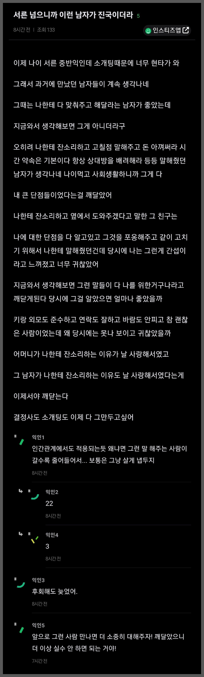 30대 중반 여자가 본 진국인 남자 작성자이장◁◁|작성시간24.07.08|조회수748 목록 댓글 4 글자크기 작게가 글자크기 크게가 다음검색 현재 게시글 추가 기능 열기 북마크 공유하기 신고 센터로 신고 댓글 댓글 4 댓글쓰기 답글쓰기 댓글 리스트 작성자라이안 | 작성시간 24.07.09 저렇게 안다고 하면서도 또 남자를 만나면 같은 실수를 반복하지요. 죽을때까지. 답댓글 작성자잠자기 | 작성시간 24.07.10 222222222 작성자시리메테우스 | 작성시간 24.07.09 그런사람들 그 나이되면벌써 임자찾았어요 작성자육기짱 | 작성시간 24.07.10 나이가 들어 사람관계에서도 느낍니다. 잔소리 쓴소리도 마음에 있어야 나오는 소리라는 것을요. 댓글 전체보기