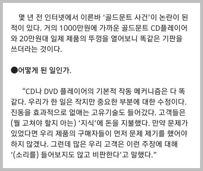 보통 골드문트사 오디오 세트는 최소 2천만원부터 수십억원이나 하는 제품군으로 유명한데 이슈는 중국에서 생산되는 파이오니어 cdp의 보드가 그대로 1천5백만원 골드문트 제품에 들어 있었다는 것이 골자이다.