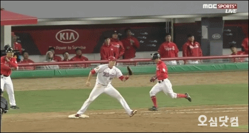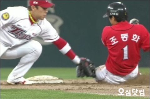 1루 주자 조동화의 도루시도 판정은 세이프 이각도에서보면 세이프라고 보일수도있다