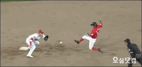 어제 오심의 특혜자 조동화가 다시 오심으로 세이프 판정을 받는다