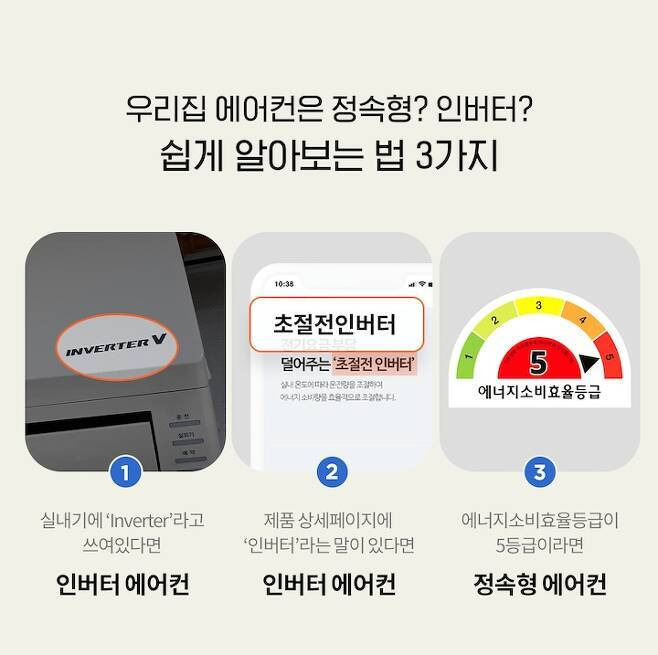 문제는 우리집 에어컨이 뭔지 어떻게 아냐는 거겠죠? 우선, 5년 이내에 새로 산 에어컨이라면 인버터일 가능성이 높아요. 2010년 들어서부터는 거의 모든 신형 에어컨은 인버터로 생산되고 있거든요. 하지만 내가 산 게 아니라서 잘 모르거나, 집에 이미 옵션으로 설치되어 있다면 확인이 필요해요. 아래 3가지 방법으로 손쉽게 확인할 수 있어요!