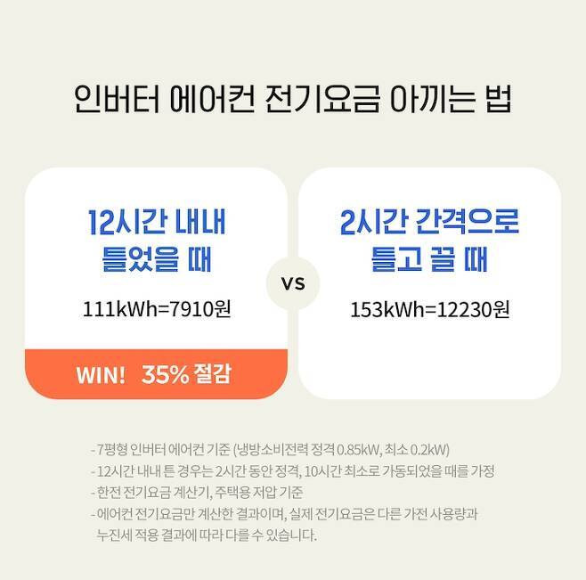 실제로 12시간 내내 에어컨을 틀어두는 게 23시간 간격으로 ON/OFF를 반복하는 것보다 예상 전기요금이 오히려 35% 더 싸거든요!